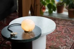 Three Ø4.5″ cast glass sphere pendants from blown borosilicate glass in a choice of three colours, braided metal coaxial cable, electrical components and metal canopy in brushed nickel or powder coated white.
