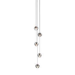 Pendant with three Ø6.5″ clear cast glass spheres from blown borosilicate glass, braided metal coaxial cable, electrical components and metal canopy in brushed nickel or powder coated white.
