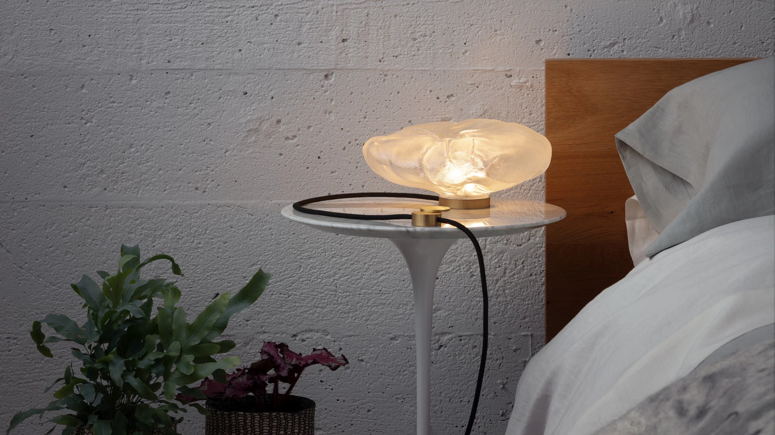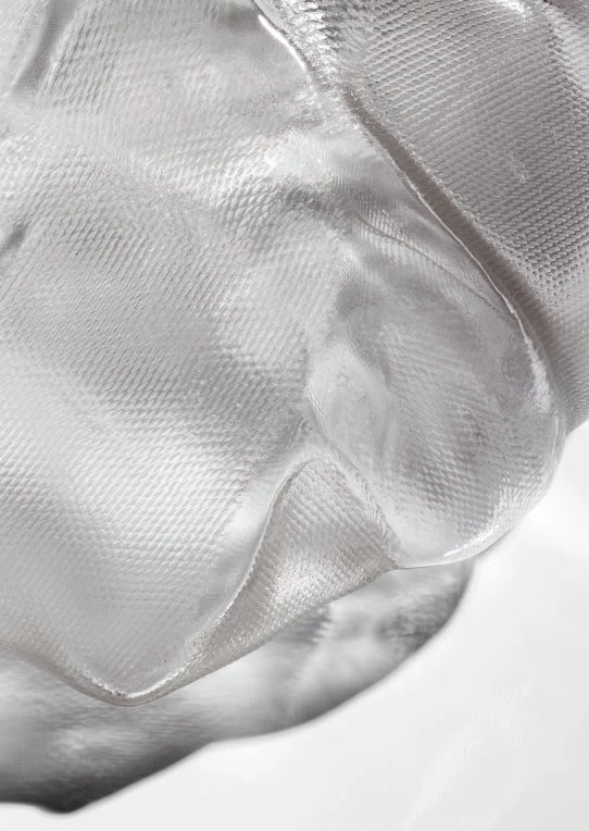73 results from blowing liquid glass into a folded and highly heat-resistant ceramic fabric vessel. The resulting shape has a formal and textural expression intuitively associated with fabric, which becomes permanent and rigid as it cools.