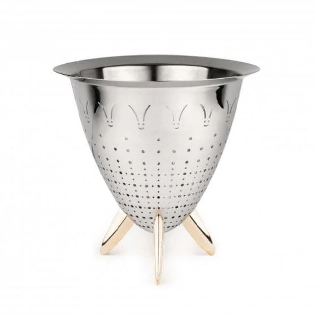 Colander in 18/10 stainless steel mirror polished outside, mat finish inside. Feet in brass casting.