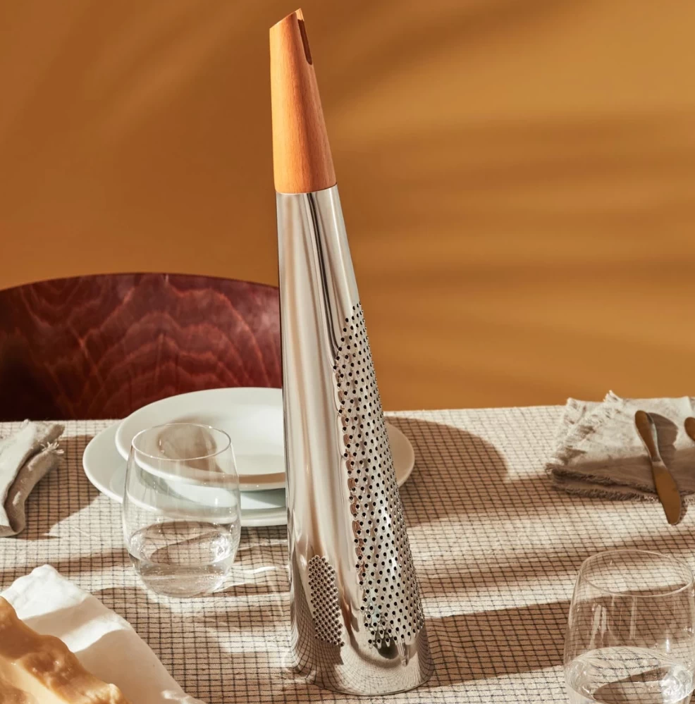 “Todo” grater has a truncated cone shaft that is exceptionally long and will grate enough cheese to satisfy the requirements for one portion just with one complete stroke. An excellent example of an object to exhibit on the table or in the kitchen, but at the same time it boasts a precise, state-of-the-art functional performance that just about transforms into playful gestural expressiveness one of the most boring and least qualifying culinary operations.