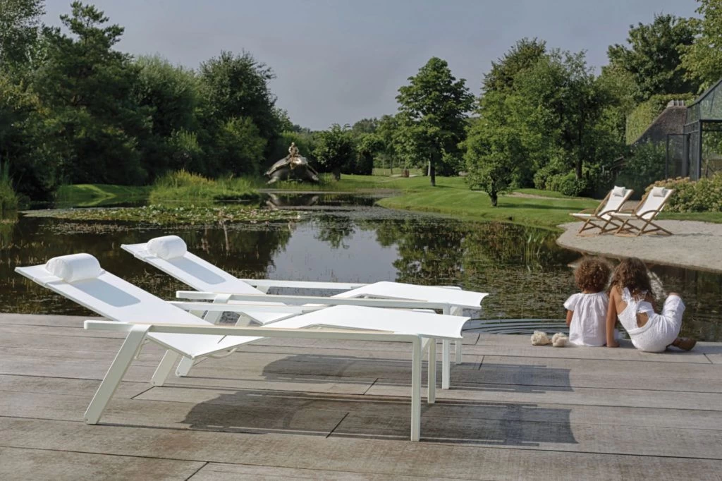 Outdoor lounger with aluminum powder-coated frame and durable, synthetic Batyline mesh.Â