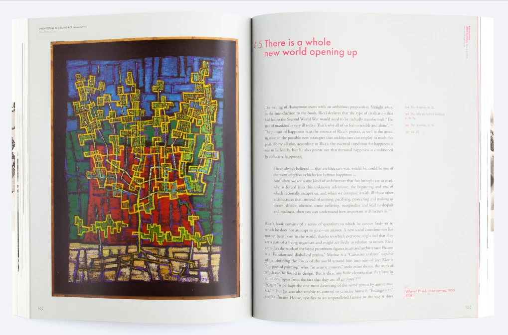 His professional activity in the passionate climate of post-war reconstruction in Italy, his communitarian projects and experimental family residences, his book Anonymous (20th Century) in which he defined with an “existentialist” approach his theories of painting, architecture, and urban planning, his visionary projects for “Earth-City” macrostructures, his innovative approach to the spatial organization of public institutions in his last projects, every step of Ricci’s work was always coherently connected to a basic aim: to translate into an architectural form the dynamism of phenomena and the incessant flow of life.