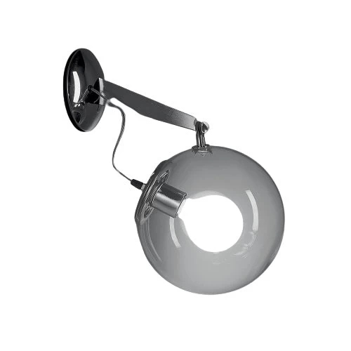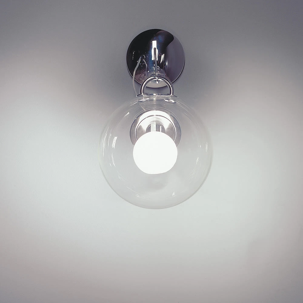 Wall light with a chromed polished metal frame and a transparent handblown glass diffuser.Â