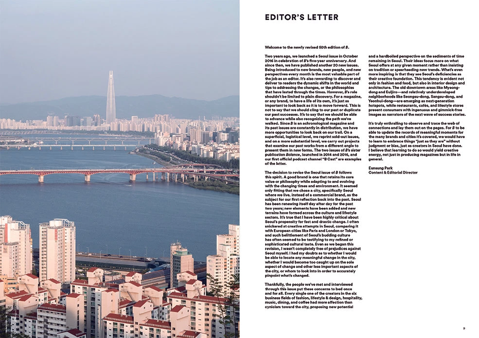 Seoul, the capital of Korea and megacity inhabited by 10 million, underwent industrialization and modernization at a miraculous pace following the Korean War. With strong economic footing in the semiconductor and automotive industries, Seoul has cultivated an authentic energy characterized by craft and dynamism, nurturing innovative minds that have come to lead the booming tech and entertainment sectors in the 21st century. This special edition of B covers the city as it has been celebrated globally, what’s happening now, and its unbounded potential through six lifestyle scenes of Seoul’s top creatives