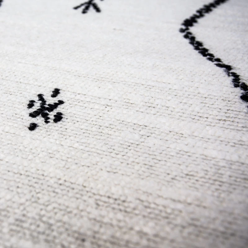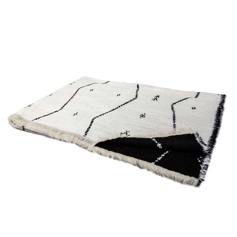 This cotton and linen woven blanket showcases a traditional Berber design in an elegant cream and black pattern, with a soft and light feel.