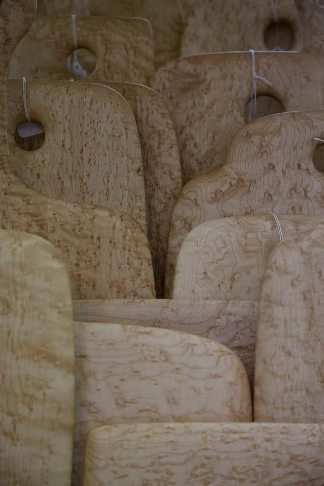 Edward’s solid bird’s-eye maple cutting boards are unlike any you’ve seen. Each board is crafted by joining sections from a single piece of specially selected, figured bird’s-eye maple, so the wood tone and figuring are consistent throughout. Each is precision-shaped and bevelled for graceful shape and balance. Individually hand-sanded and finished to a sensual silkiness, each board is an art object designed to add aesthetic and utilitarian pleasure to your daily life.