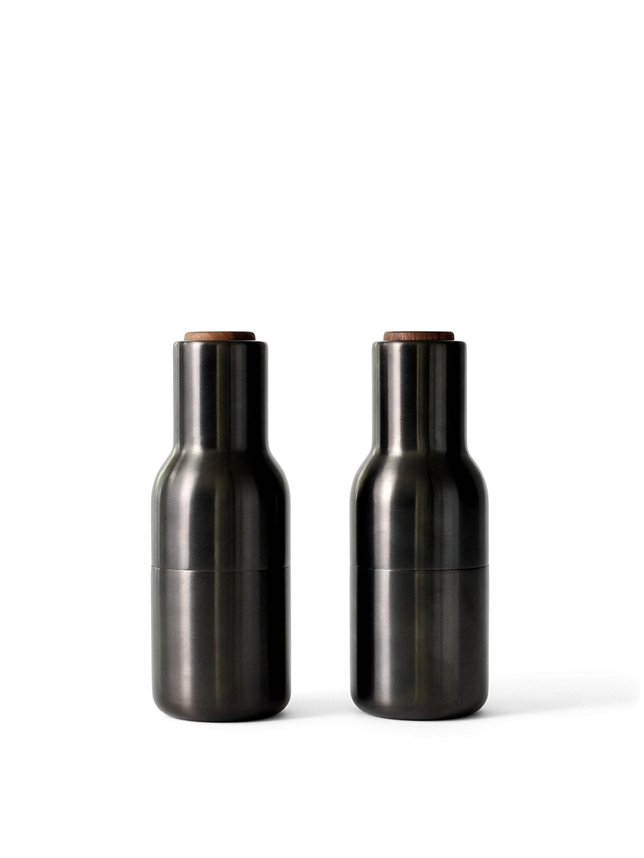 Set of two grinders, plastic, ceramic or brass and stainless steel body with wood lid. BPA free.