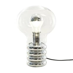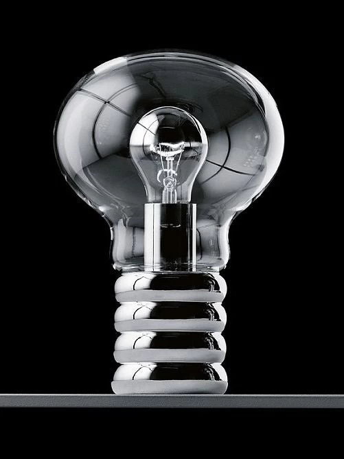 Bulb is the first luminaire by Ingo Maurer. Bulb looks like an oversized light bulb: inside the body made of mouth-blown crystal glass from Murano, a conventional light bulb shines with a mirrored dome. The base is made of chromed metal. The oversized bulb is often compared to Pop Art.
