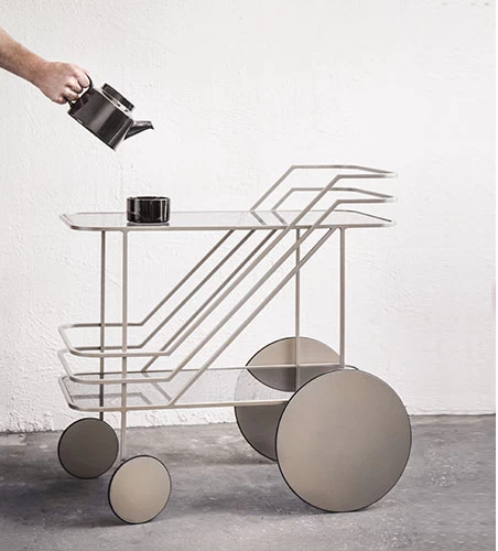 Come As You Are is a steel serving trolley with a shelf and rotating front wheels. The graphical and bi-dimensional bar cart references the classic hostess service trolley. Pared down to its bare essentials, the piece is made of steel and features two horizontal glass surfaces for increased capacity. Â
