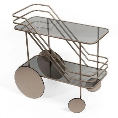 Bar cart in powder-coated steel with a choice of finishes, and smoked tempered glass panels. Designed by Christophe de la Fontaine.