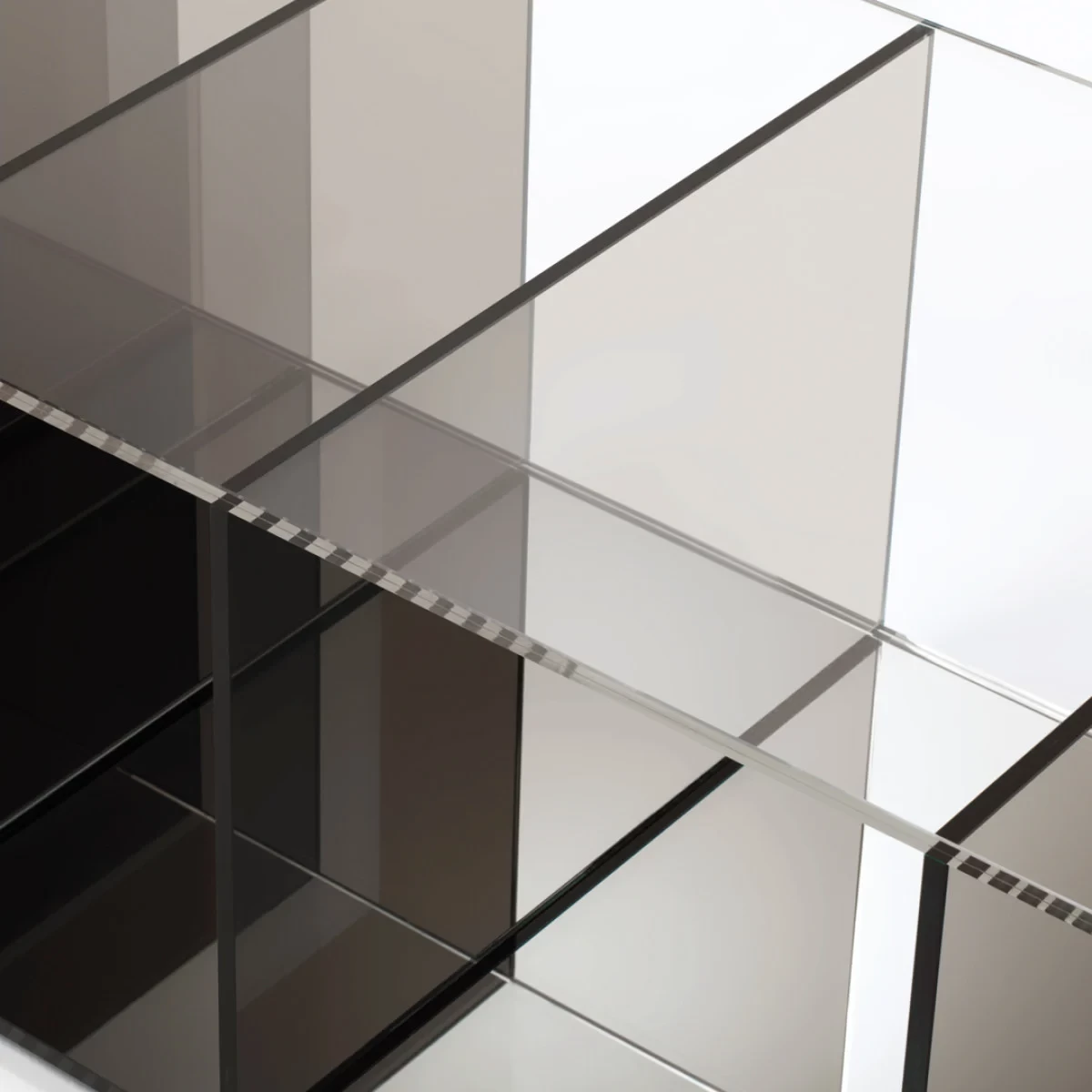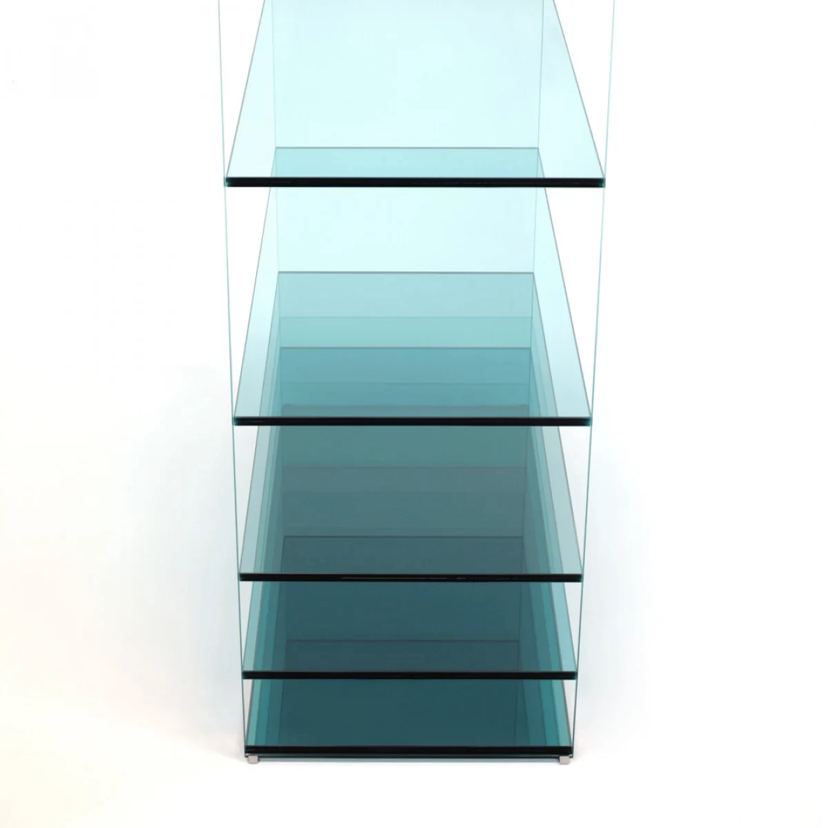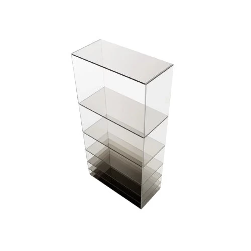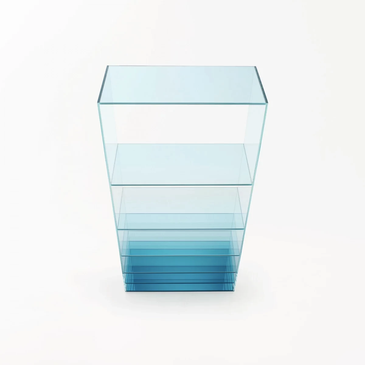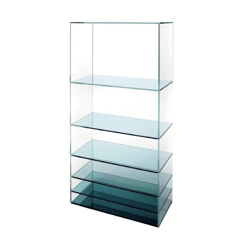 Collection of low tables and bookcases in a laminated and thermo-welded transparent extra-light glass. The shelves of the bookcase and the vertical elements of the low tables are in coloured transparent glass available in grey or blue tone. Moving from one element to the next, the distance between them gradually decreases, whilst the intensity of colour increases. This chromatic effect, associated with the mirror bases, bestows great depth to the pieces and a play of magical reflections.