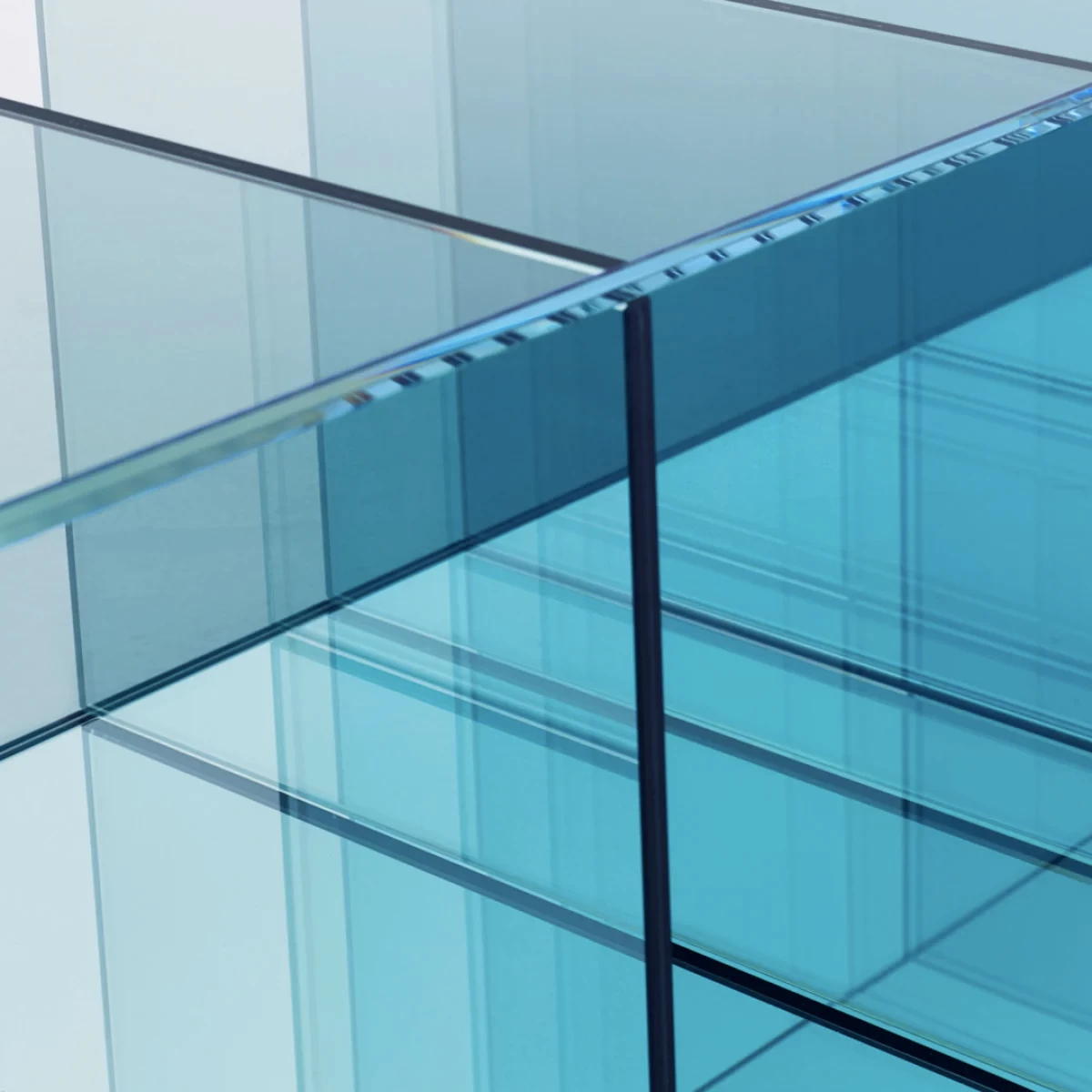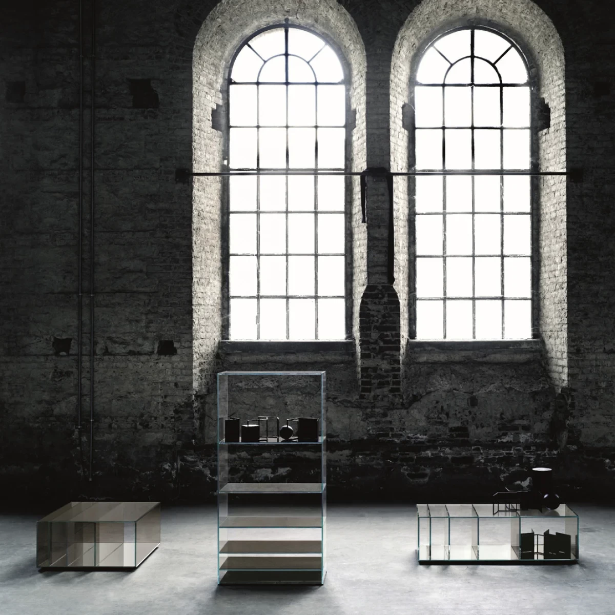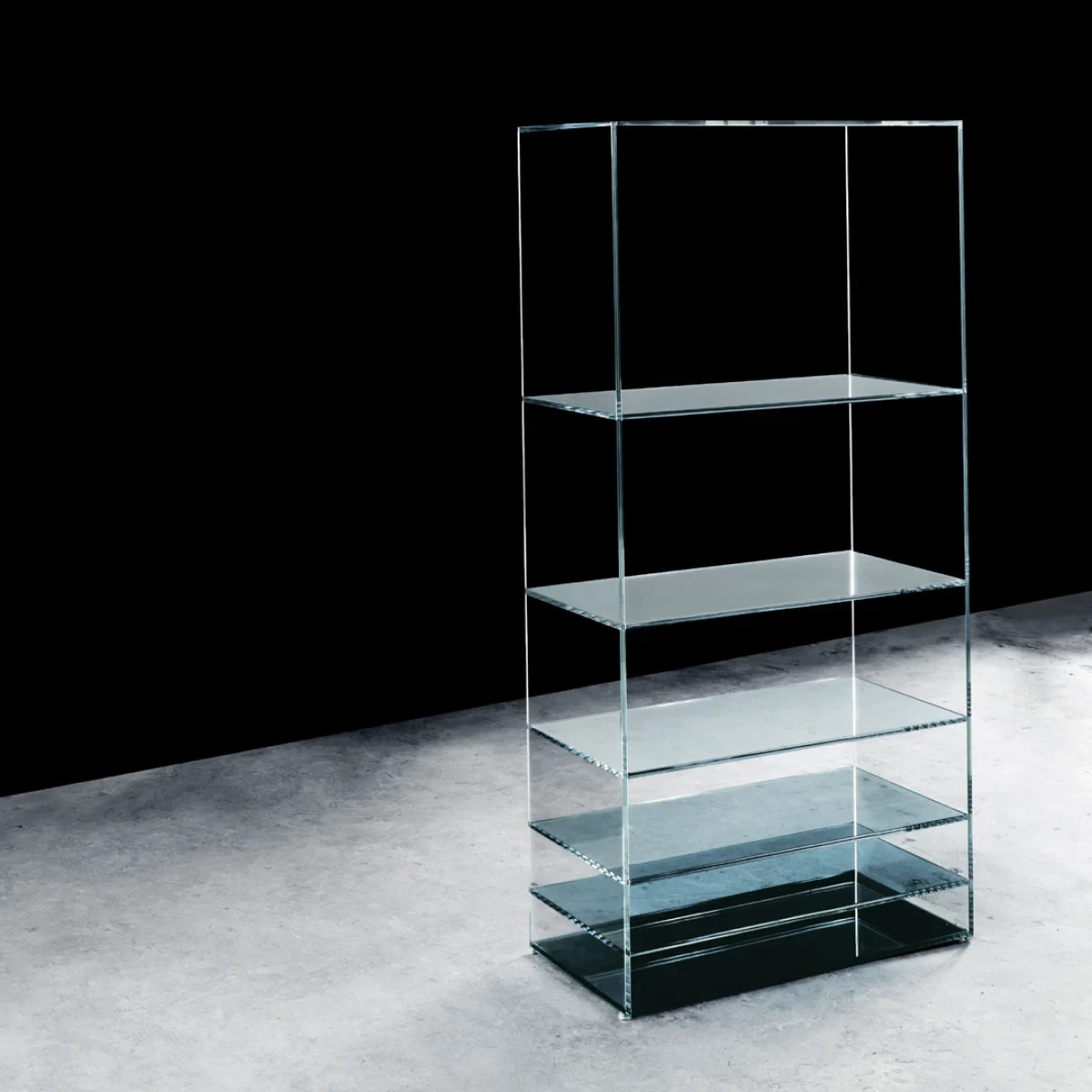 Collection of low tables and bookcases in a laminated and thermo-welded transparent extra-light glass. The shelves of the bookcase and the vertical elements of the low tables are in coloured transparent glass available in grey or blue tone. Moving from one element to the next, the distance between them gradually decreases, whilst the intensity of colour increases. This chromatic effect, associated with the mirror bases, bestows great depth to the pieces and a play of magical reflections.