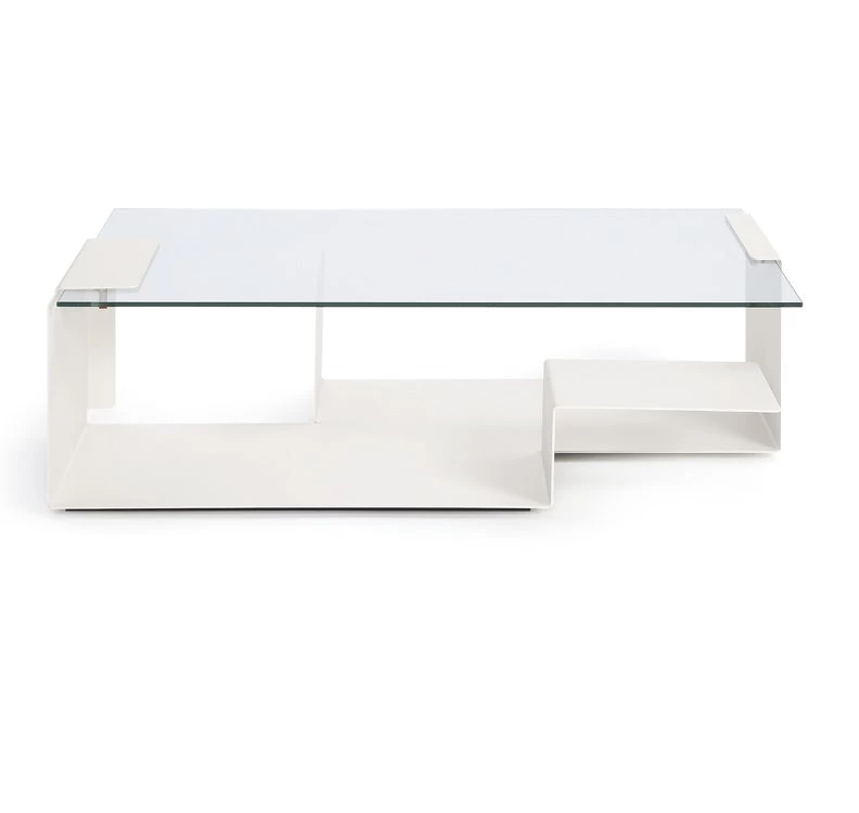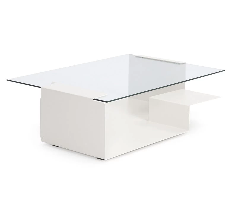 Side table in sheet steel with powder-coated, fine texture. Tabletop in clear crystal glass. Bottom covered with polyethylene.