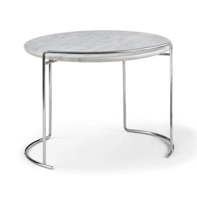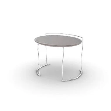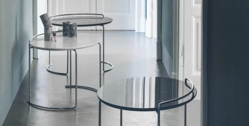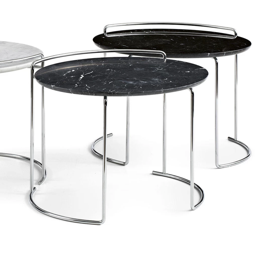 The low table known as Djuna, was designed by Kazuhide Takahama in 1983, and is dedicated to Barnes’ writing style. This American author was one of the leading figures of the 1920s bohemian scene in Paris. The poised, delicate style of this table is characterized by the folded chrome-finish bent steel frame. The elliptical tabletop is available in a variety of finishes, including painted polyester, either mirror-gloss or matte, alternatively, white Carrara, or black Marquiña, marble.