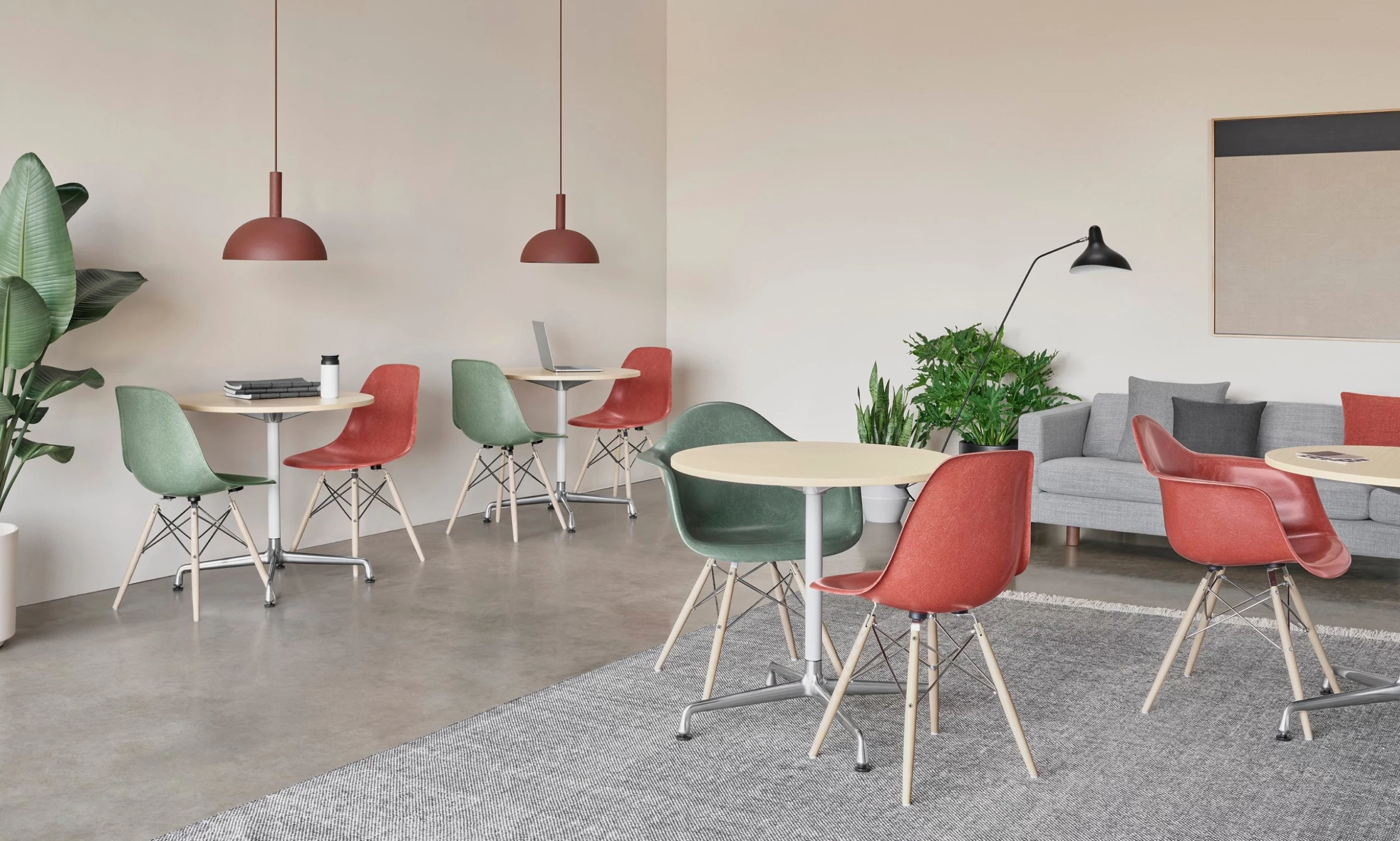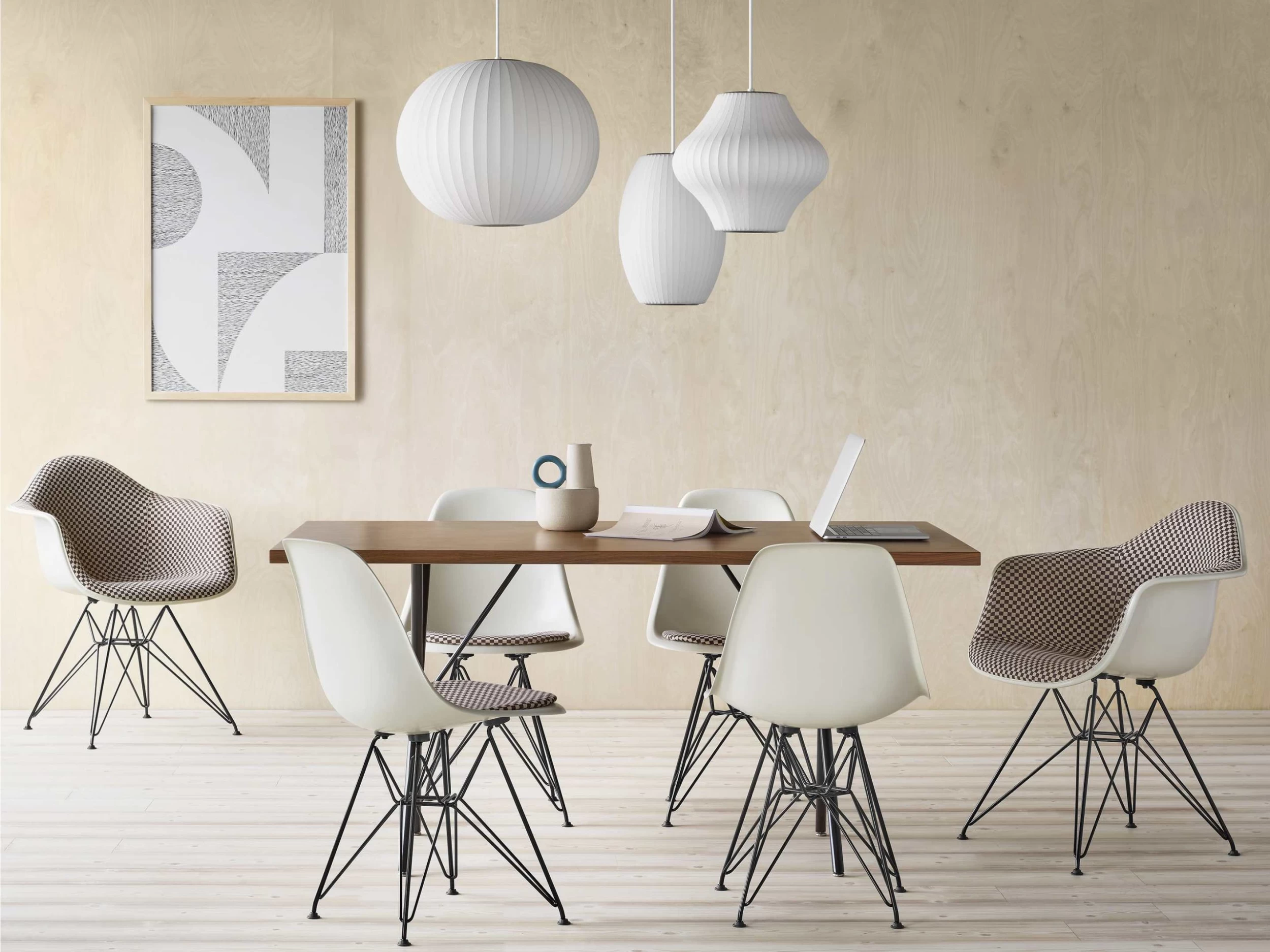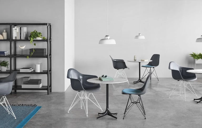Thanks to a new proprietary process of producing fiberglass, Herman Miller is once again able to produce the Eames original 1950 Molded Fiberglass Chair safely by means of a less volatile, monomer-free “dry bind” process. Like the Eameses’ original single-shell chairs, the new fiberglass finish has the same covetable surface variation and tell-tale fiberglass striations that have attracted avid vintage collectors for decades.