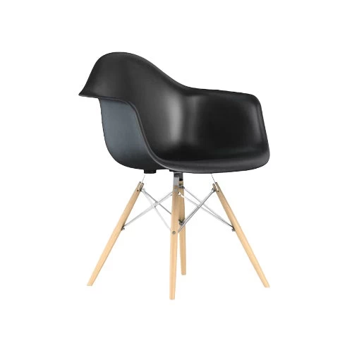 Armchair with a fiberglass shell and a wood dowel base with a black wire frame.