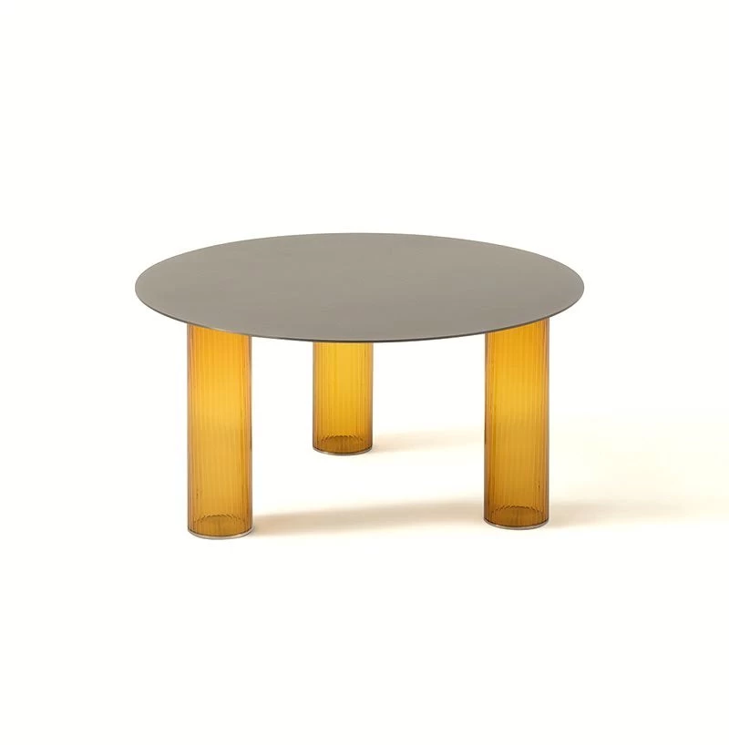 Side table with three blown glass legs in a choice of colours and a steel sheet top in a nickel-satin finish.Â