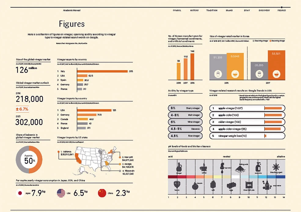 Vinegar is a fermented substance created when acetic acid bacteria transforms ethanol into acetic acid. A powerful flavor enhancer, vinegar complements the natural tastes of ingredients and creates endless savory variations. It is so versatile that acclaimed fine-dining chefs are often tempted to create their very own vinegars. All it requires is water, some air, acetic acid bacteria, and any ingredients of the maker’s choice. Traditional balsamic vinegar from Modena, Italy and rice vinegar from Asia are two iconic varieties of the seasoning liquid. Now, with the rapid growth of the homemade vinegar market, we can more easily discover unique vinegar-based products that reveal the creator’s unique tastes with additions like maple syrup, rose petals, or fruits such as tangerines and plums. Vinegar has secured a firm place in the world of gastronomy, and continues to brighten tables across the world with splashes of acidic flavors.