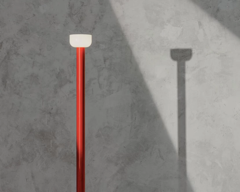 A simple lamp archetype adapted to outdoor wall and bollard models. The floor model comes as a painted aluminum stem surmounted by an indirect light-emitting, blown glass reflector.Â