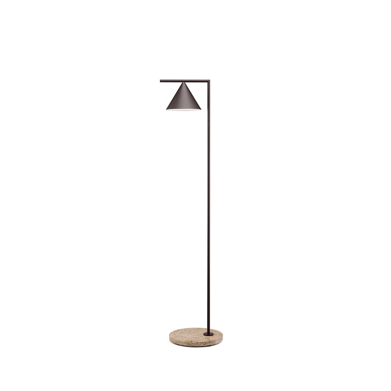 Dimmable floor lamp with a spinning cone diffuser, providing direct light that can be repositioned. Frame and cone in painted steel or a brushed brass finish. The base of the lamp is weighted by lava stone from the base of the Etna Volcano in Sicily or travertino imperiale stone, from Tuscany, is composed of vegetal fragments and carbonate.