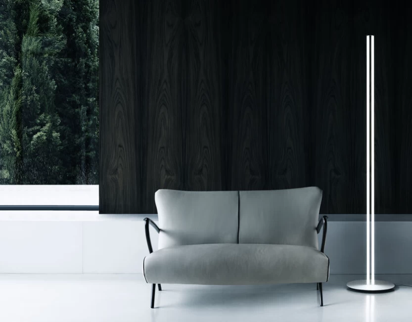 Floor lamp made of extruded anodized aluminum with a champagne or argent finish and a diffuser in platinum optical silicone with an integrated LED strip (CRI 95). Usable power cable length 260 cm with pedal dimmer switch for ON/OFF and adjustable brightness 10–100%. Power supply attached to the interchangeable plug. Dimmable.Â