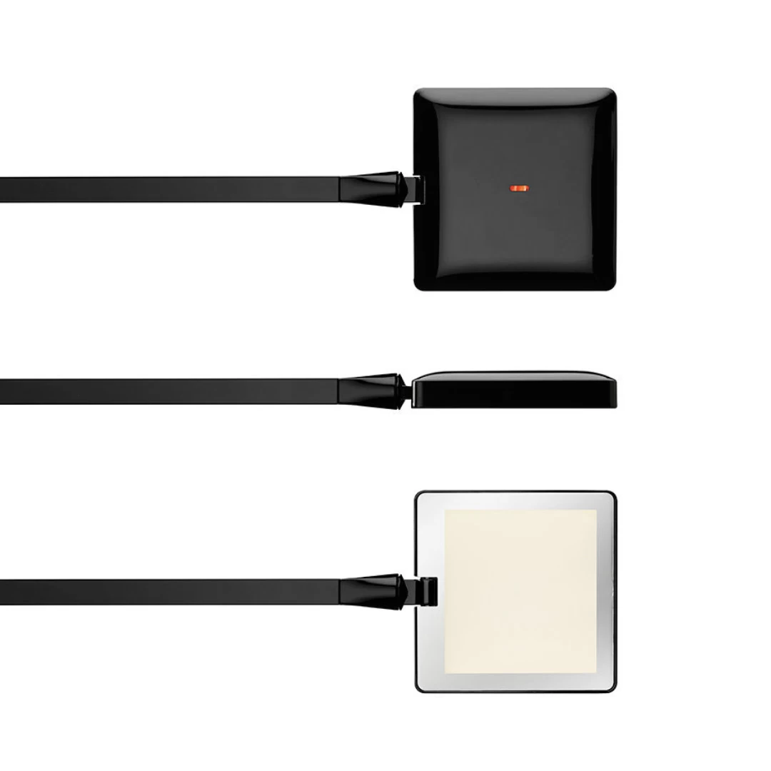 Table lamp with aluminum painted or chromed body with die-cast head, joints, and forks, and extruded arms. Its diffuser’s perimeter is photoengraved polycarbonate (PC) and aluminate. It offers direct light via innovative Edge Lighting Technology™, and the optical switch sensor on the lamp’s head provides a three-step dimming function and colour temperature adjustment at 2700K or 3200K.
