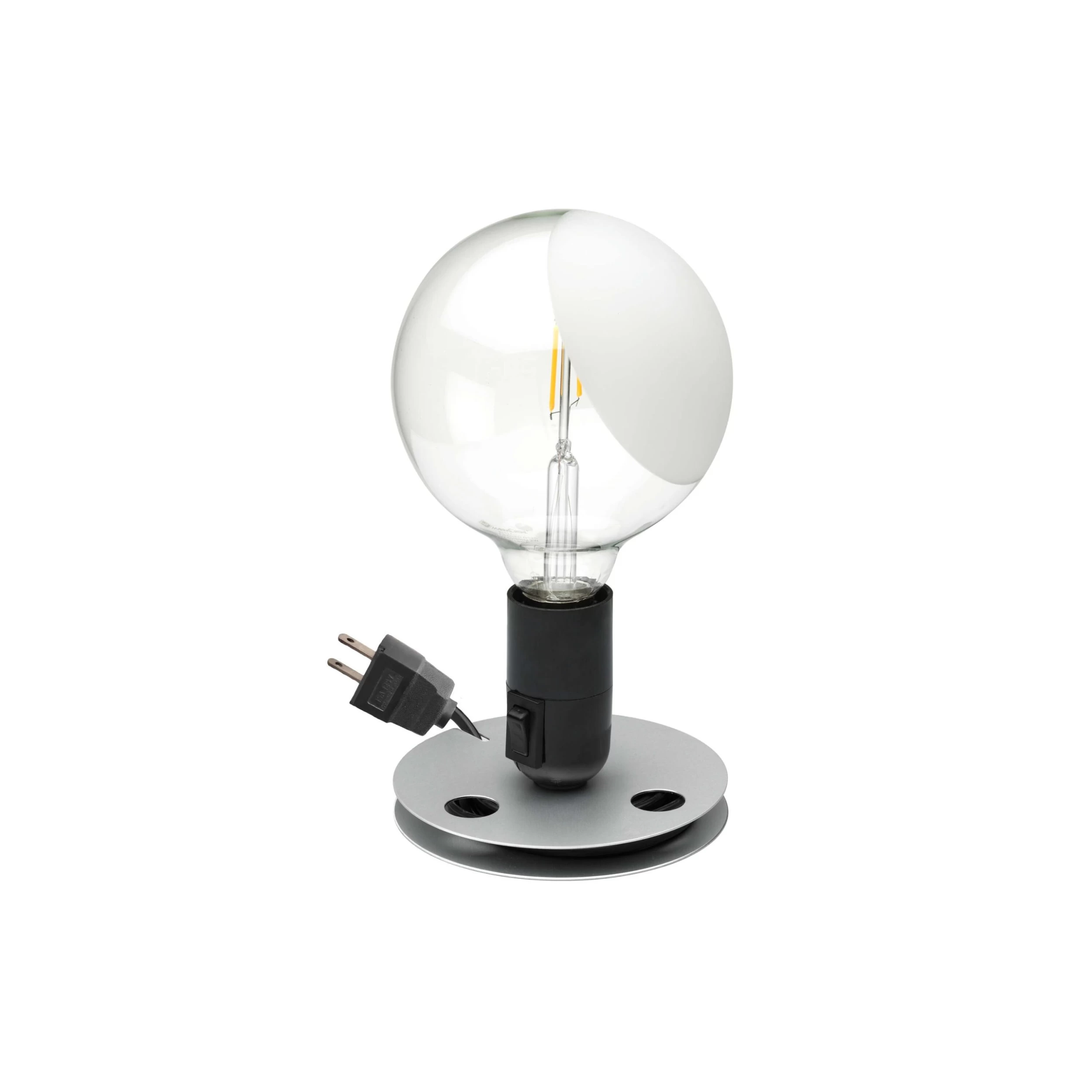 Table lamp with a clear glass globe, partly sandblasted, and a base in anodized aluminum. On/Off switch on the lamp holder.