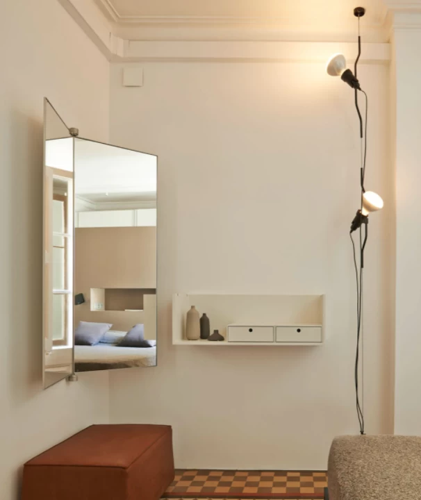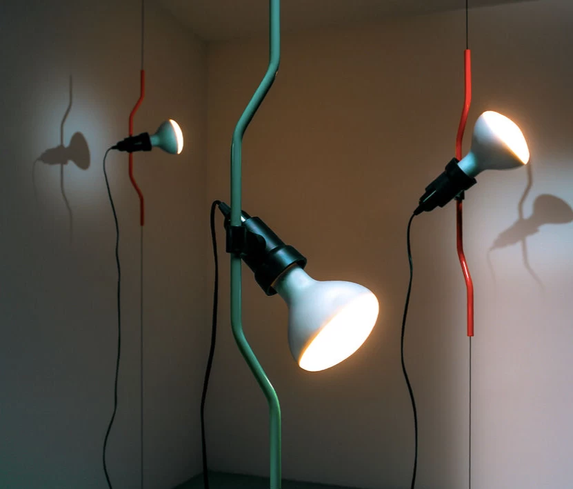 “Pio Manzù had the original idea for Parentiesi,” explains Achille Castiglioni. “He thought up a fixed vertical boom and a cylindrical box with a slot for the light, which went up and down: you stopped it with a screw. He replaced the boom with a metal cord that, when bent, creates friction and enables the lamp to be in position without requiring any screws.”