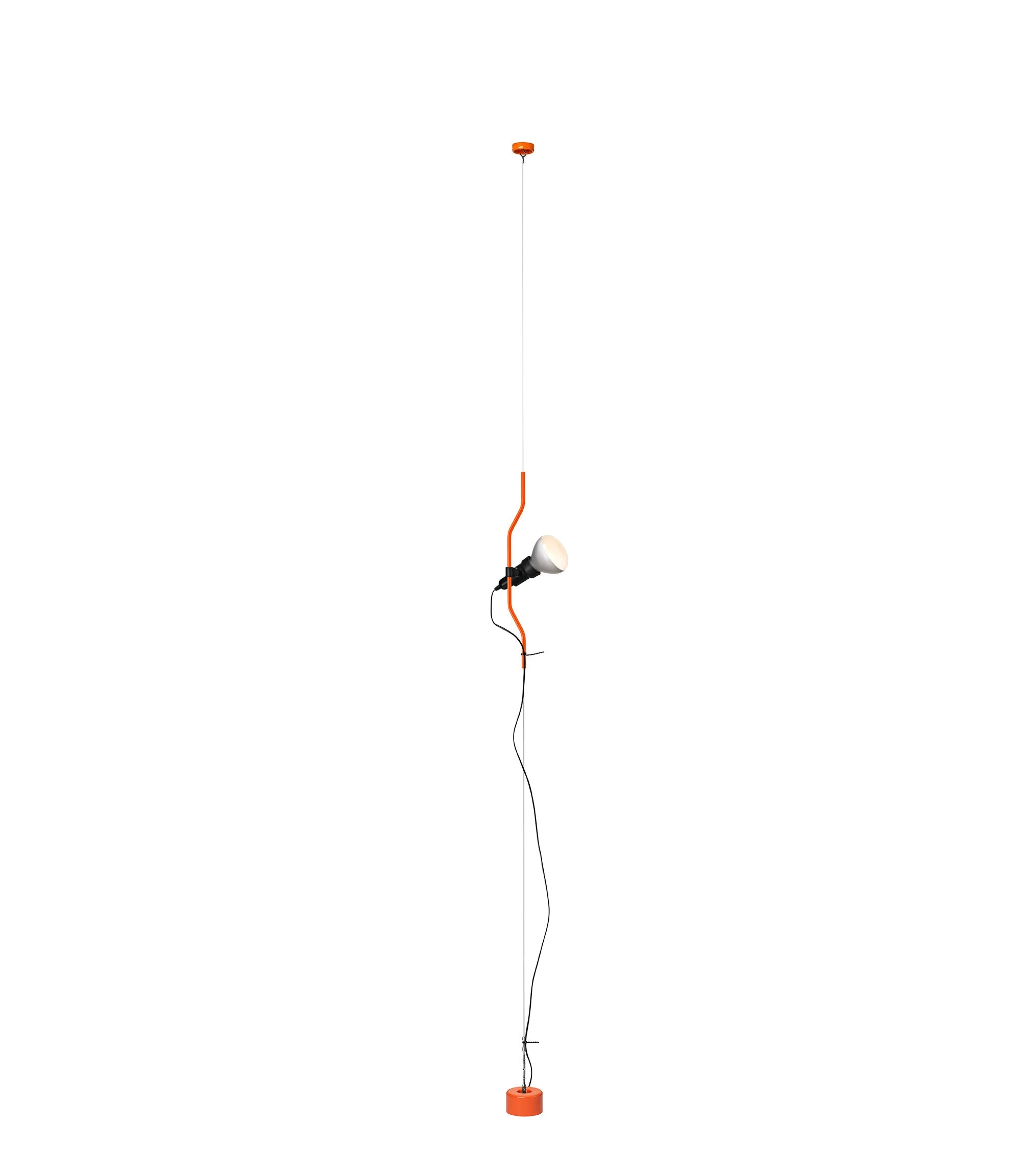 Pendant light providing direct light. Nickel-plated shaped tube on a ceiling to floor steel cable. The head fixture is an injection-moulded black elastomer that comes with a switch. Available in a choice of finishes. Lightbulb not included.