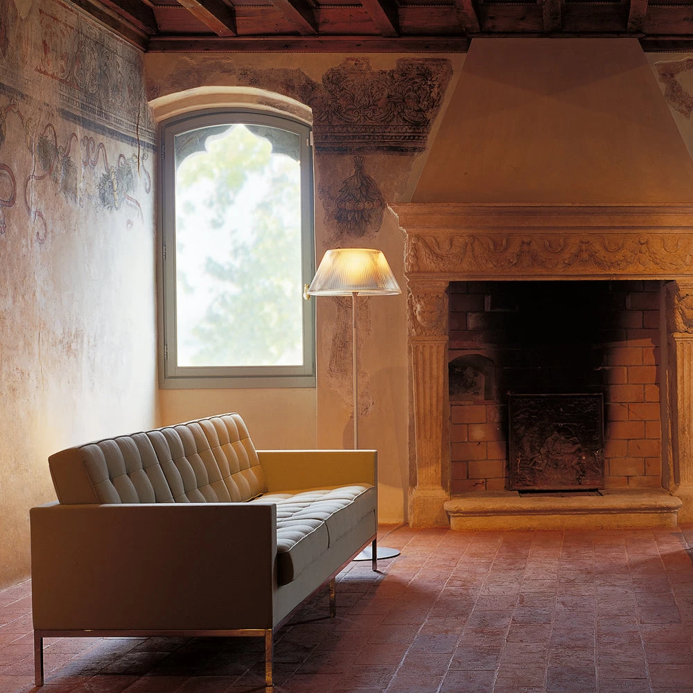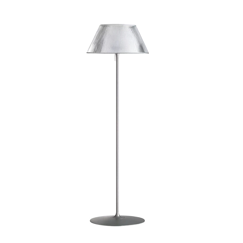 Floor lamp with fluted glass shade and internal opal glass diffuser supported by a silver stem, cast yoke and base. On/off dimmer switch on cord.
