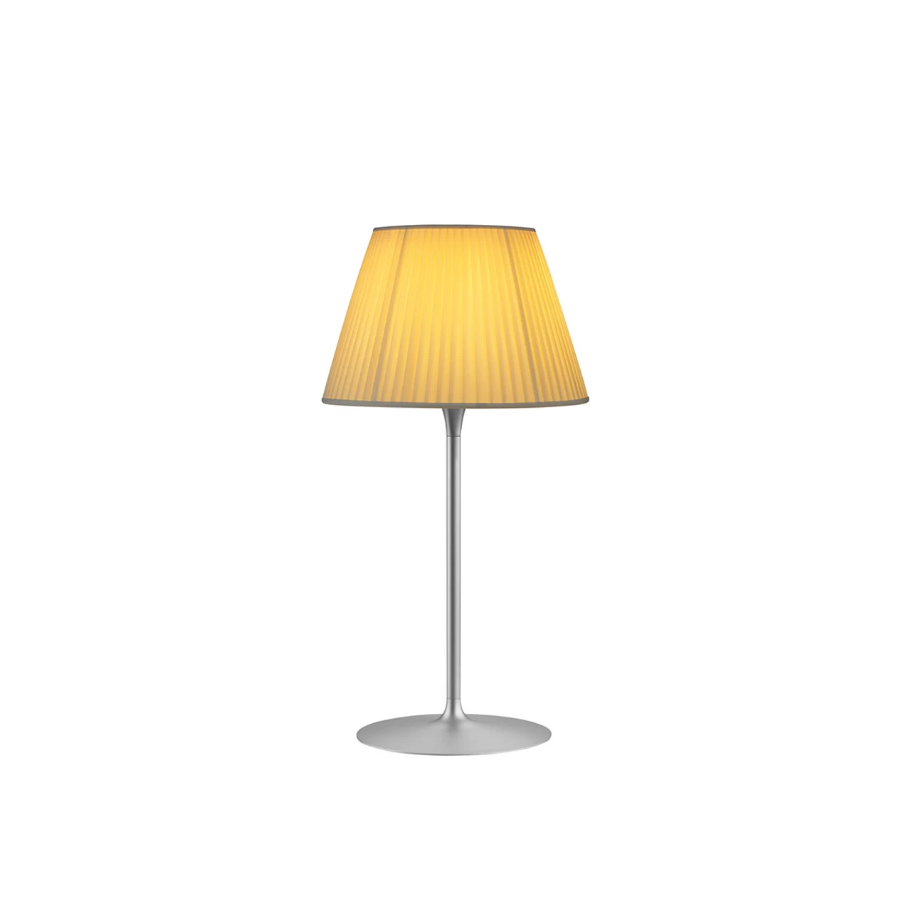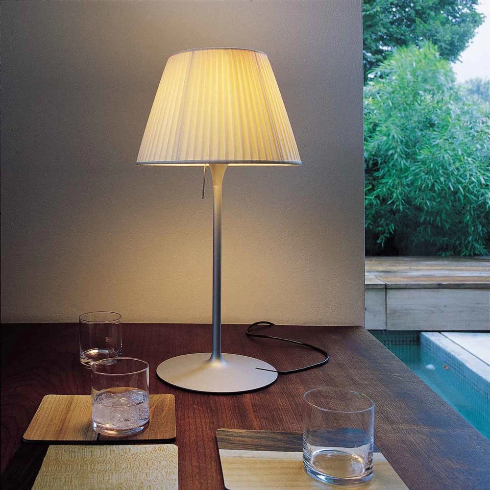 Part of the Romeo family created by industry innovator Philippe Starck, this stunning and strikingly simple table lamp provides diffused light through a plissé cloth shade and acid-etched pressed borosilicate glass internal diffuser. This lamp comes with a 0% to 100% dimmer switch.