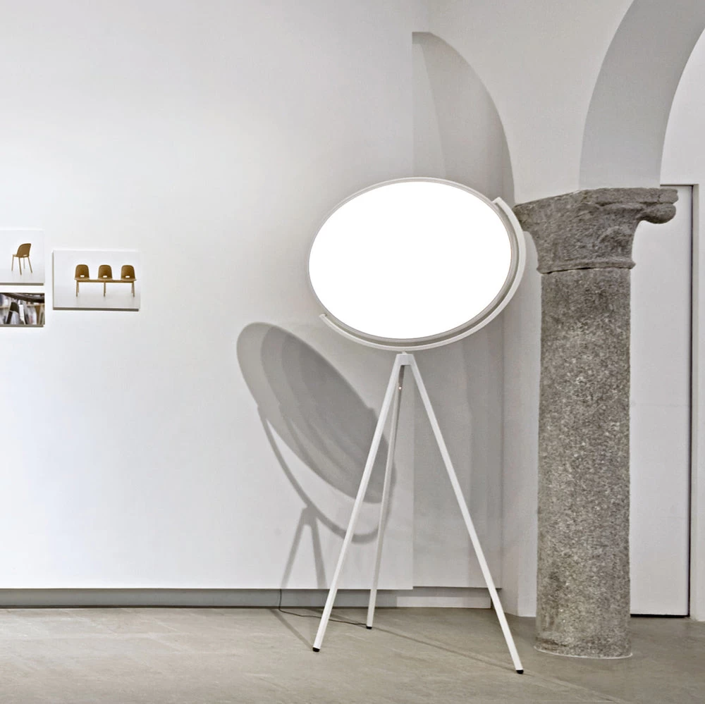 It was a few years ago that Piero Gandini introduced Jasper Morrison to the innovative use of LED technology that became known as “Edge Lighting.” Morrison was inspired by the way it allowed him to send light sideways and how, when incorporated into the edge of a flat composite disc of translucent white material, it gave the appearance of a flat white disc. “Superloon is the answer to the question of what to do with this intriguing technology,” says Morrison. “Mounting the disc on a gyroscopic axis allows the light to be [sent] in infinite directions. The light it gives out is broad and diffused but can be dimmed to a soft glow.”