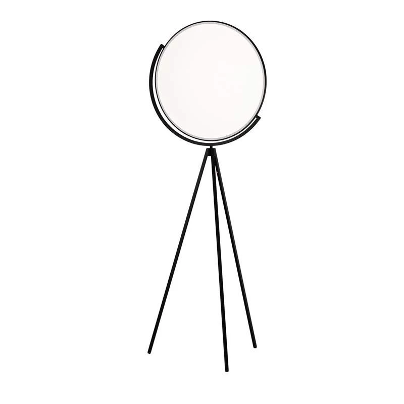 Floor lamp providing direct light. Frame in a painted or chrome-plated aluminum frame with a metal spinning head. Diffuser in silk-screened PMMA.
