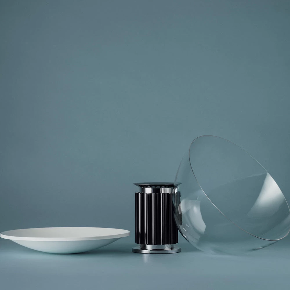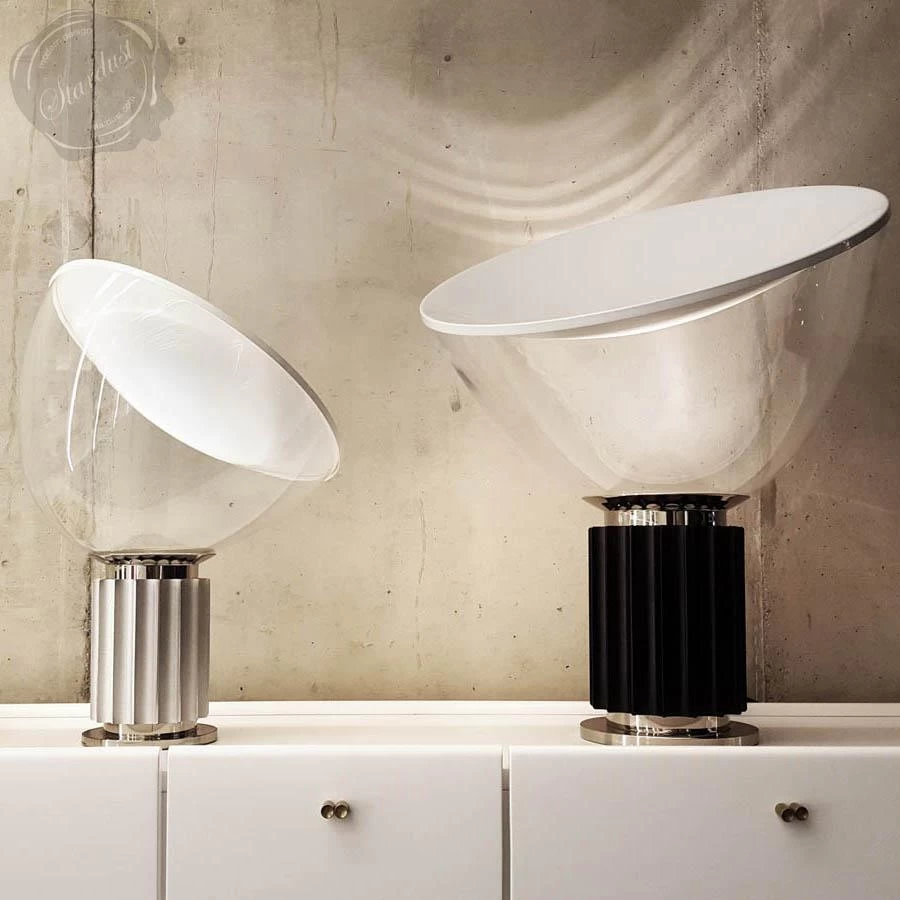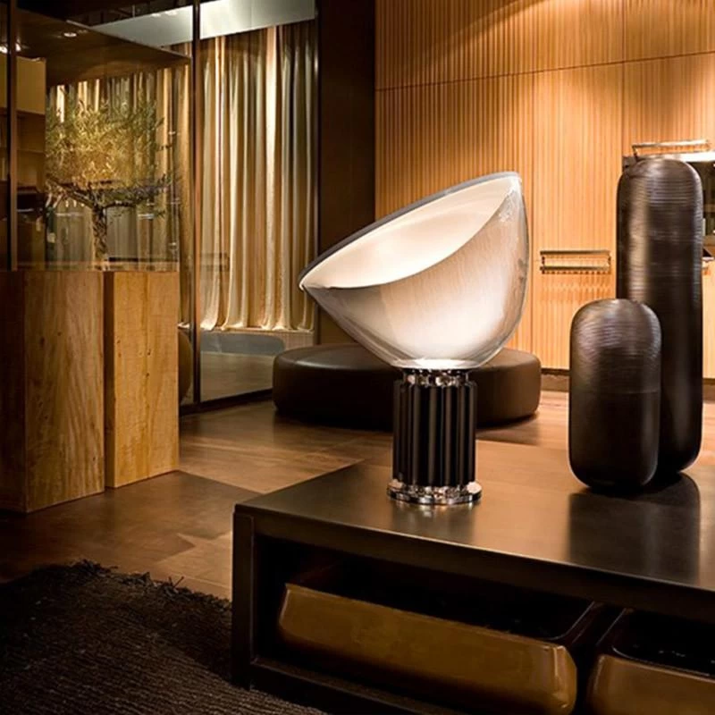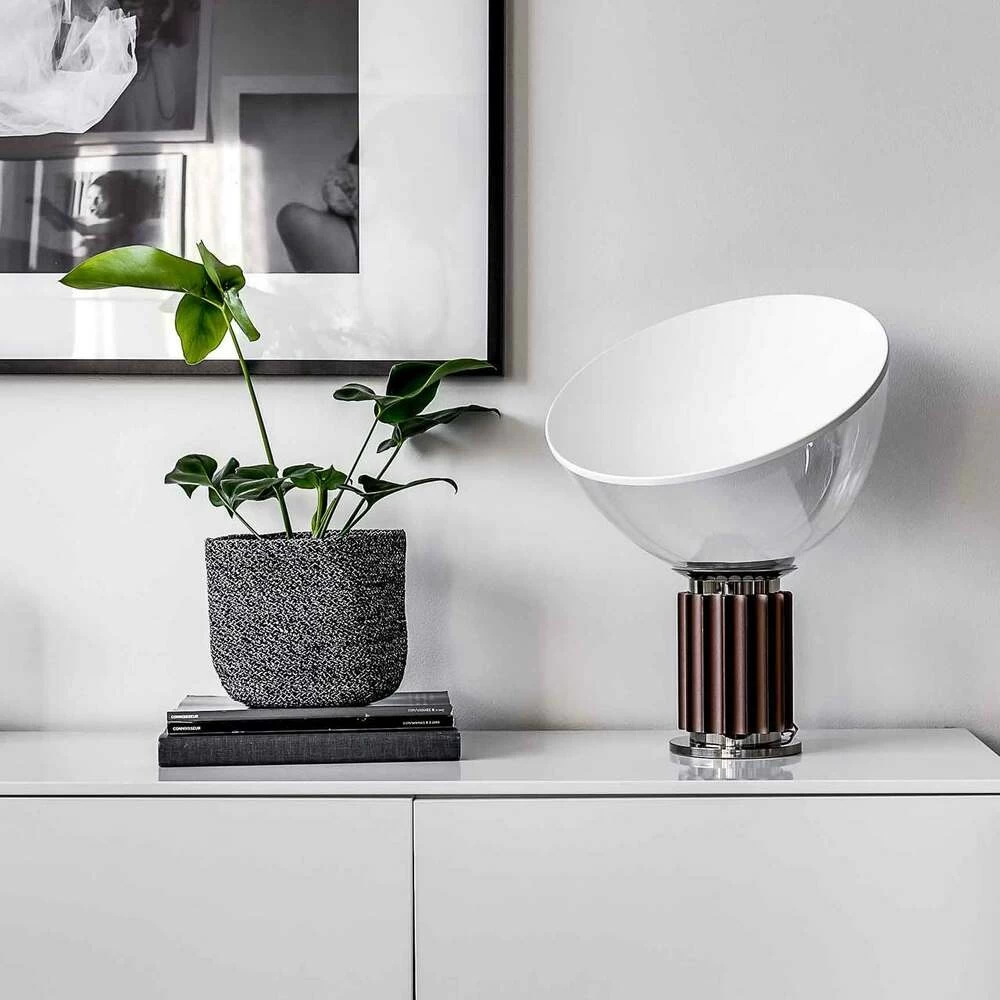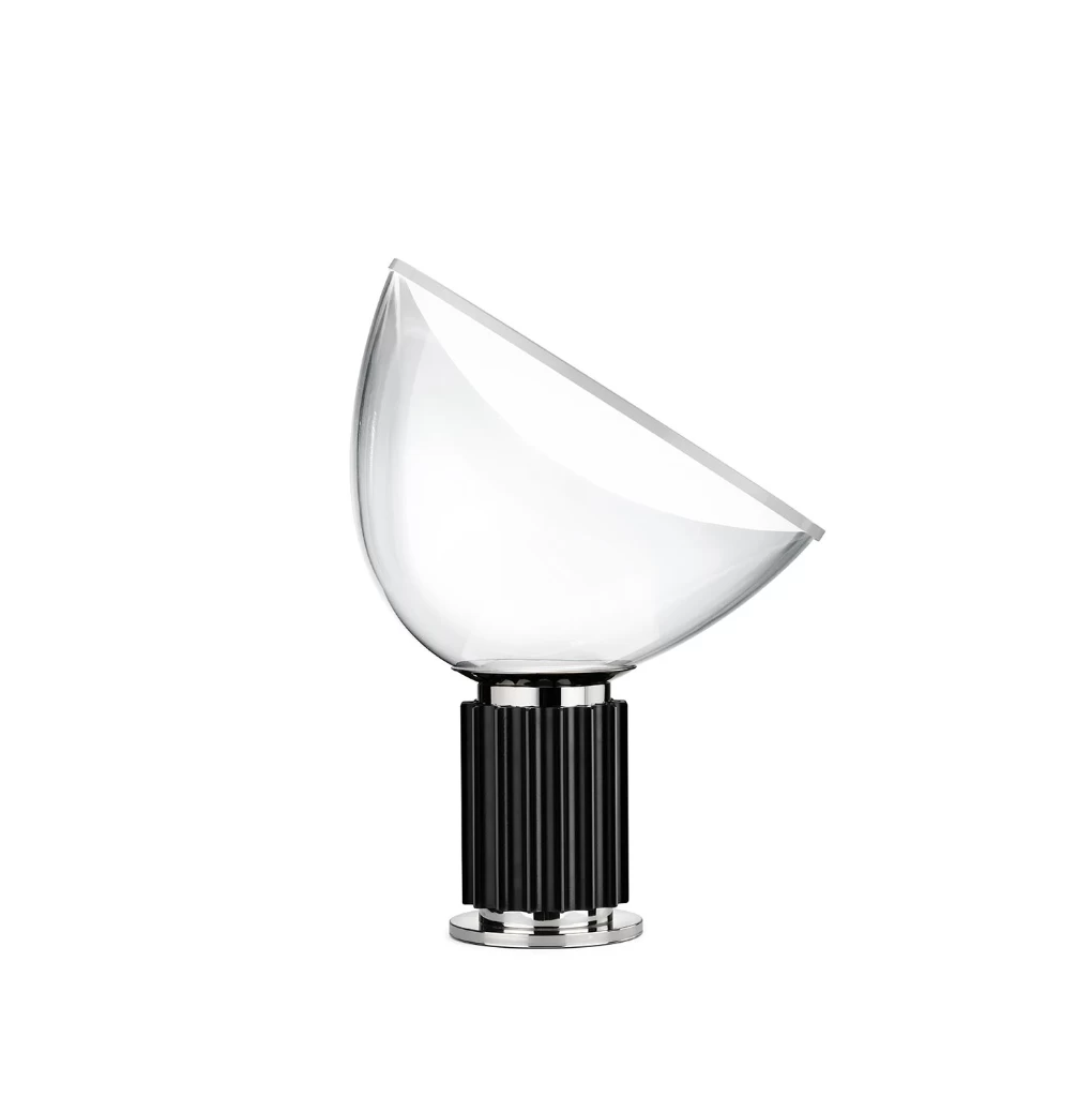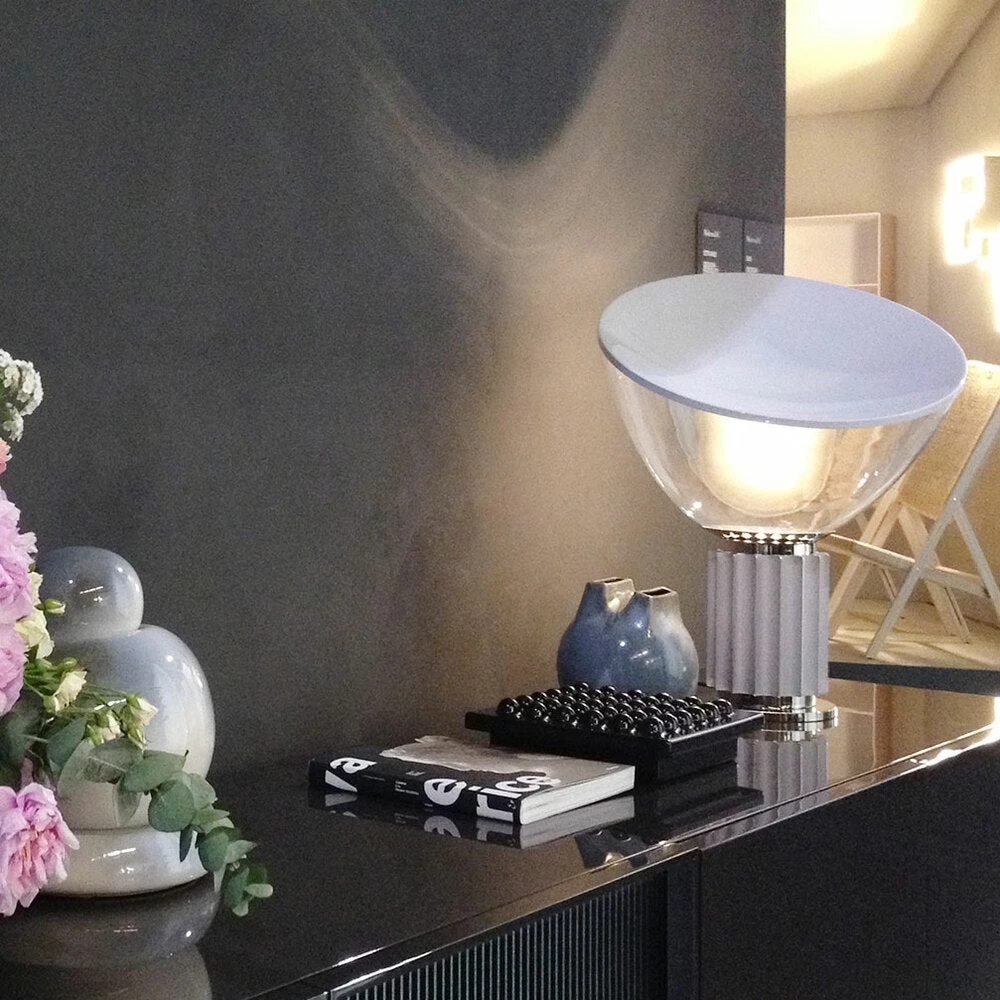 Designed by the famed duo in 1962, the iconic Taccia has a concave spun aluminum reflector with a matte white finish. Its light can be manually adjusted by positioning the blown glass diffuser as necessary. This designer table lamp’s base is made of extruded aluminum and is available in an anodized matte black or natural sandblasted finish.