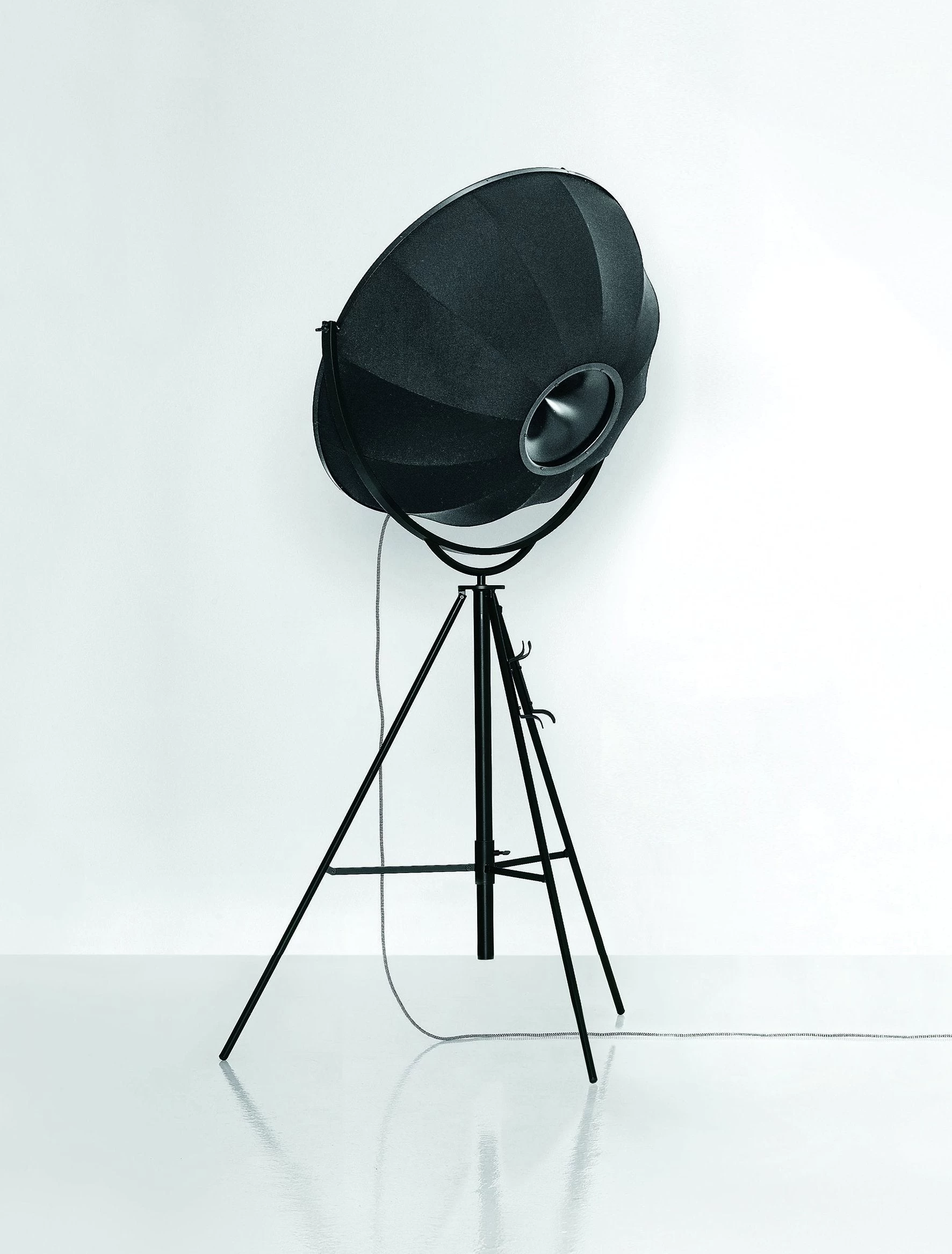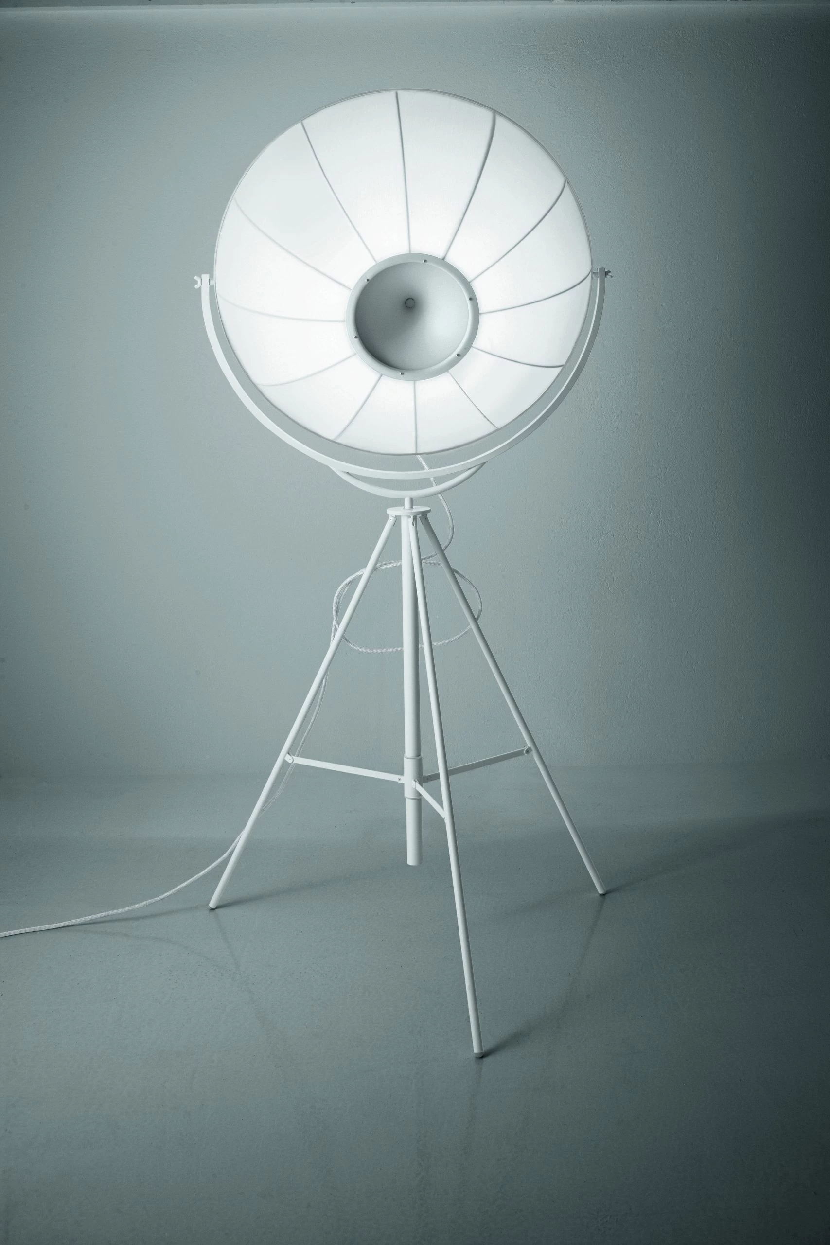 Floor lamp with metal powder-coated base and a cotton-lined diffuser in black or white. Adjustable height.Â