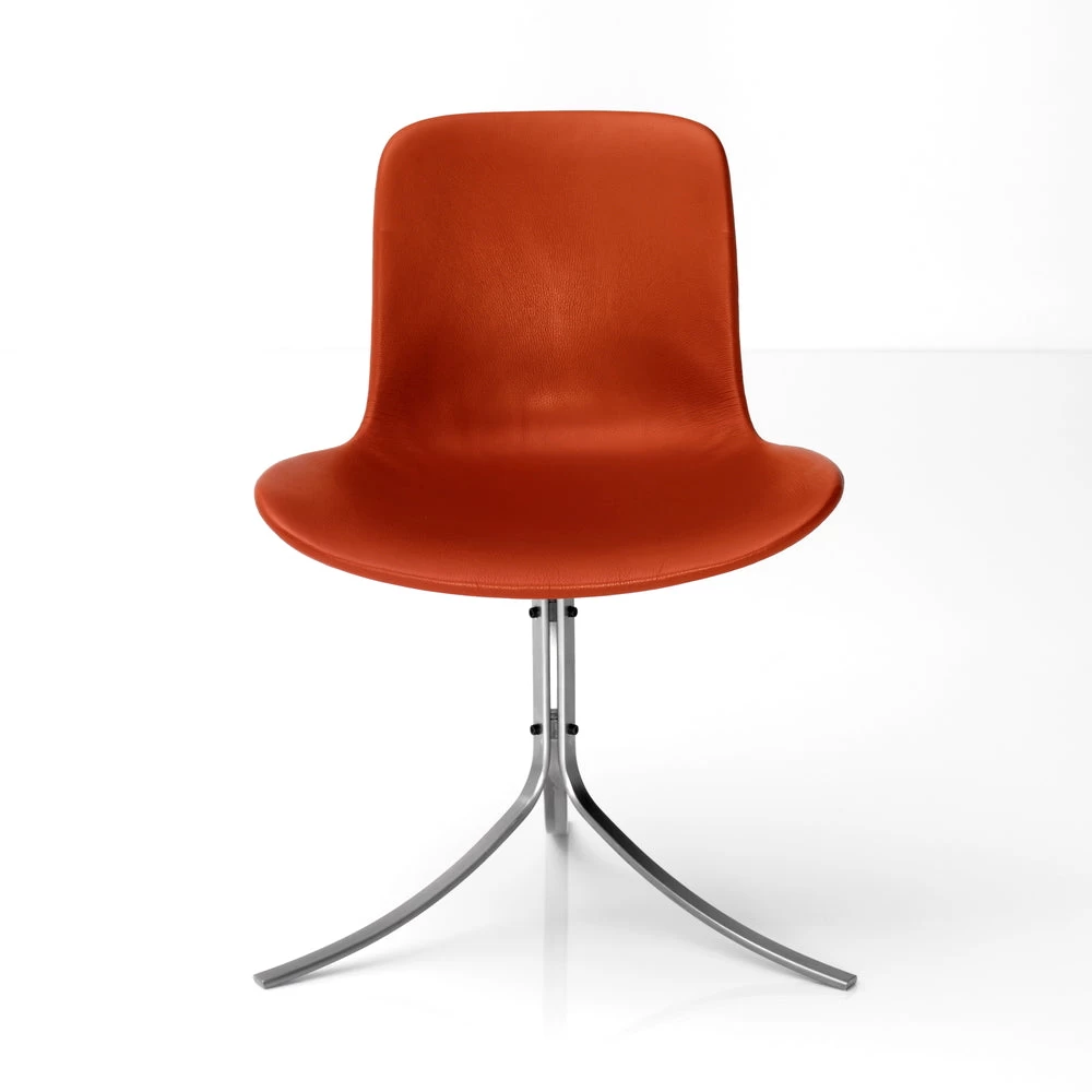 The PK9’s unique shape is characterized by three pieces of satinbrushed stainless spring steel that act as a column, carrying the leather seating element. Poul Kjærholm was inspired by a sand imprint of his wife’s behind from a day at the beach. Later, during the design process, Hanne Kjærholm sat in boxes of clay to find the most optimal and comfortable solution.