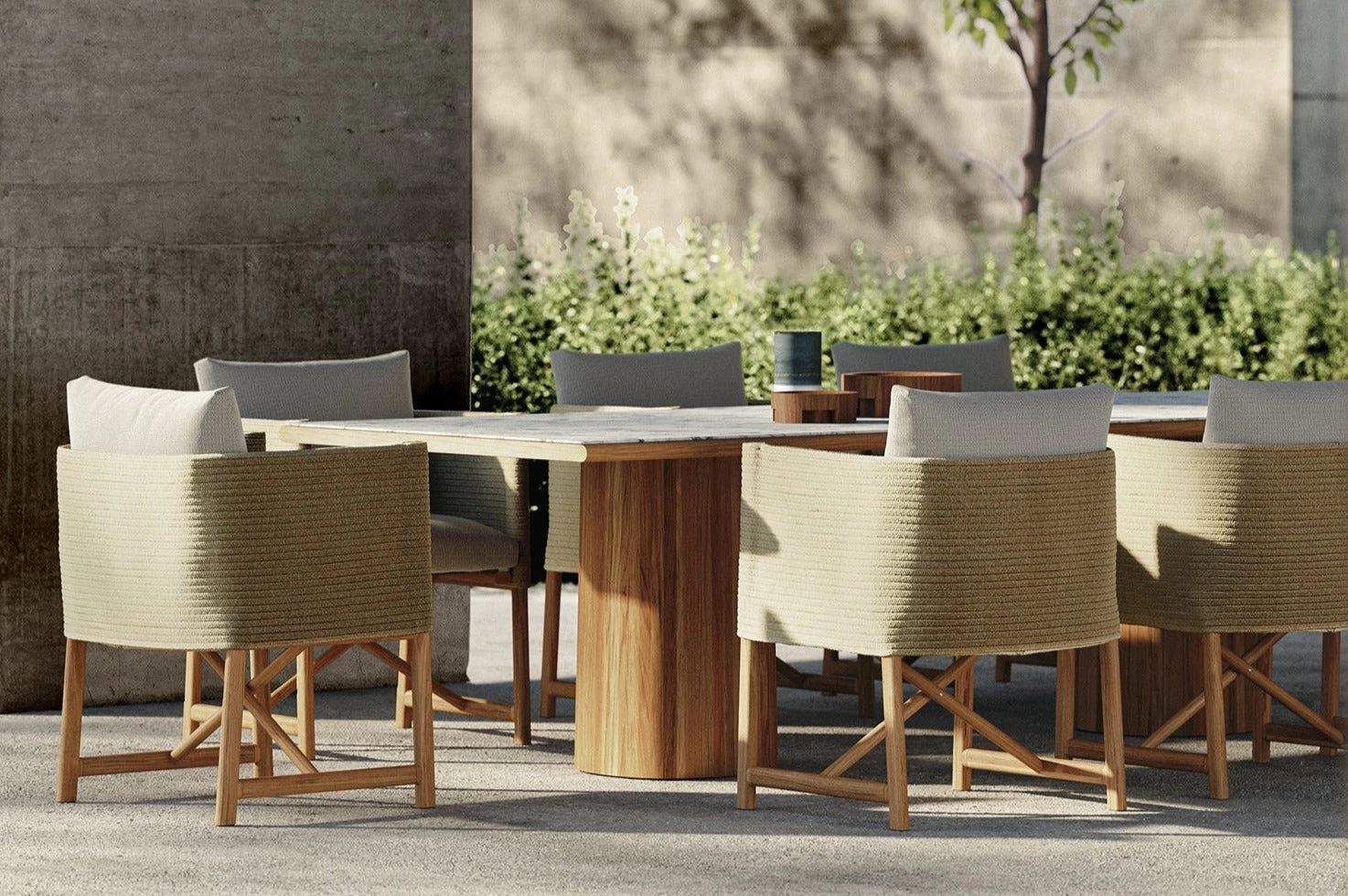 Outdoor dining table with a ceramic top in Gris du Gent with teak legs and frame. Includes outdoor cover.Â