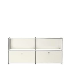 A functional storage credenza with an open top section and two drop down doors on the bottom that lock with the twist of a coin. Available in a choice of standard colour finishes.Â