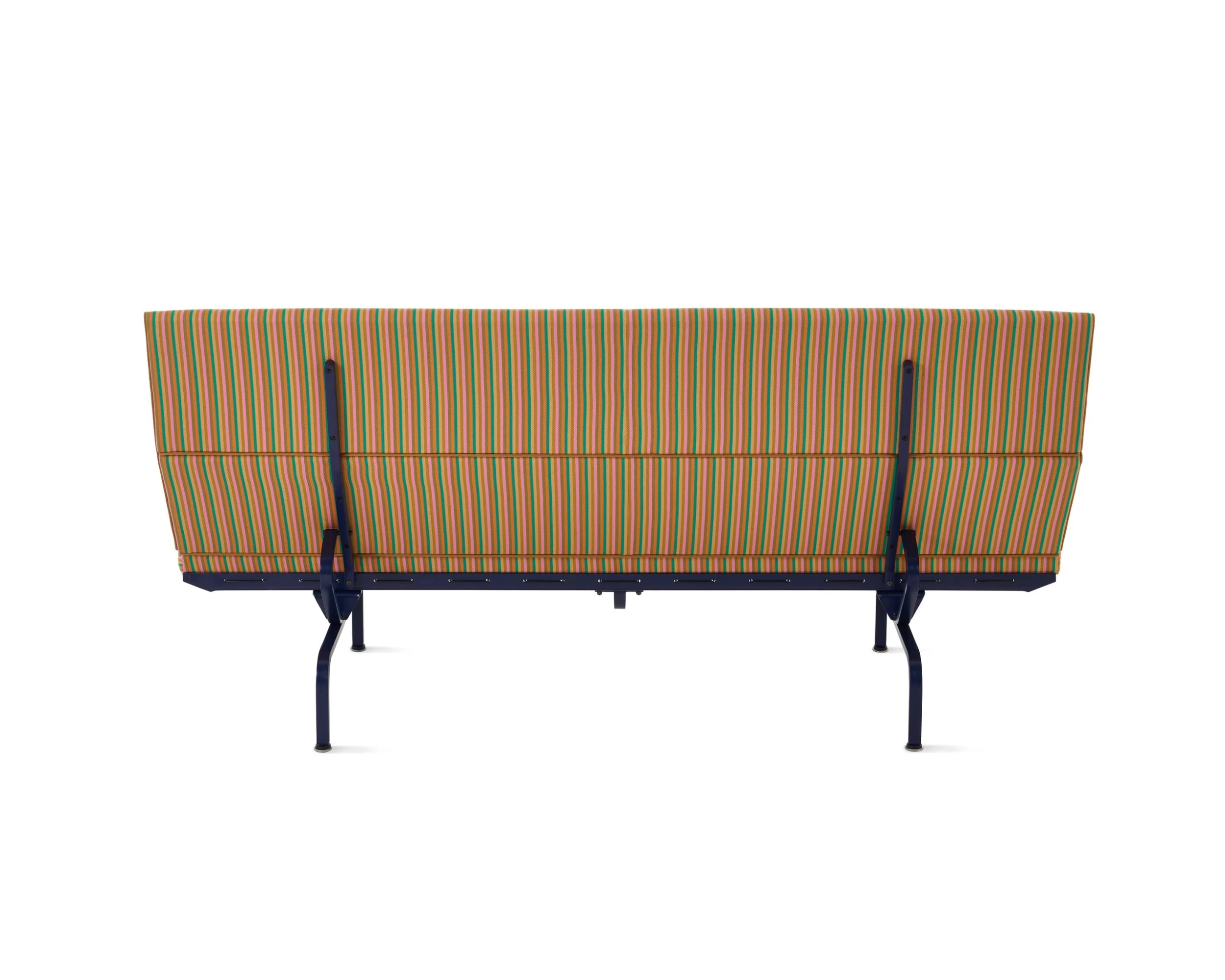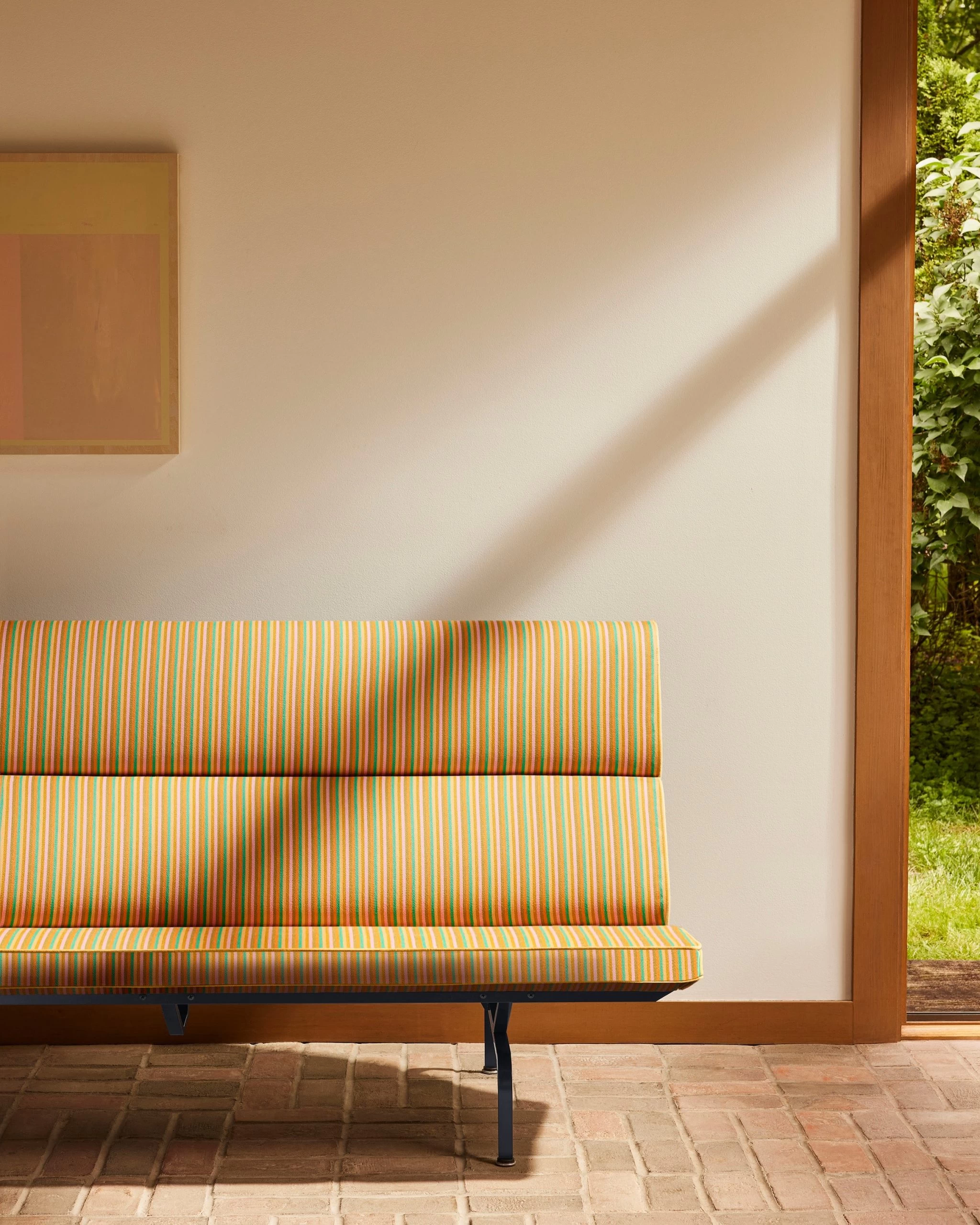 The Eames Sofa Compact is offered in a special re-issue of the Jacob’s Coat textile designed by Alexander Girard (1959) and paired with subtle black-blue frame. The Jacob’s Coat textile is made using a rare, intensive vertical weaving technique that creates incredibly vibrant, concise coloured stripes.