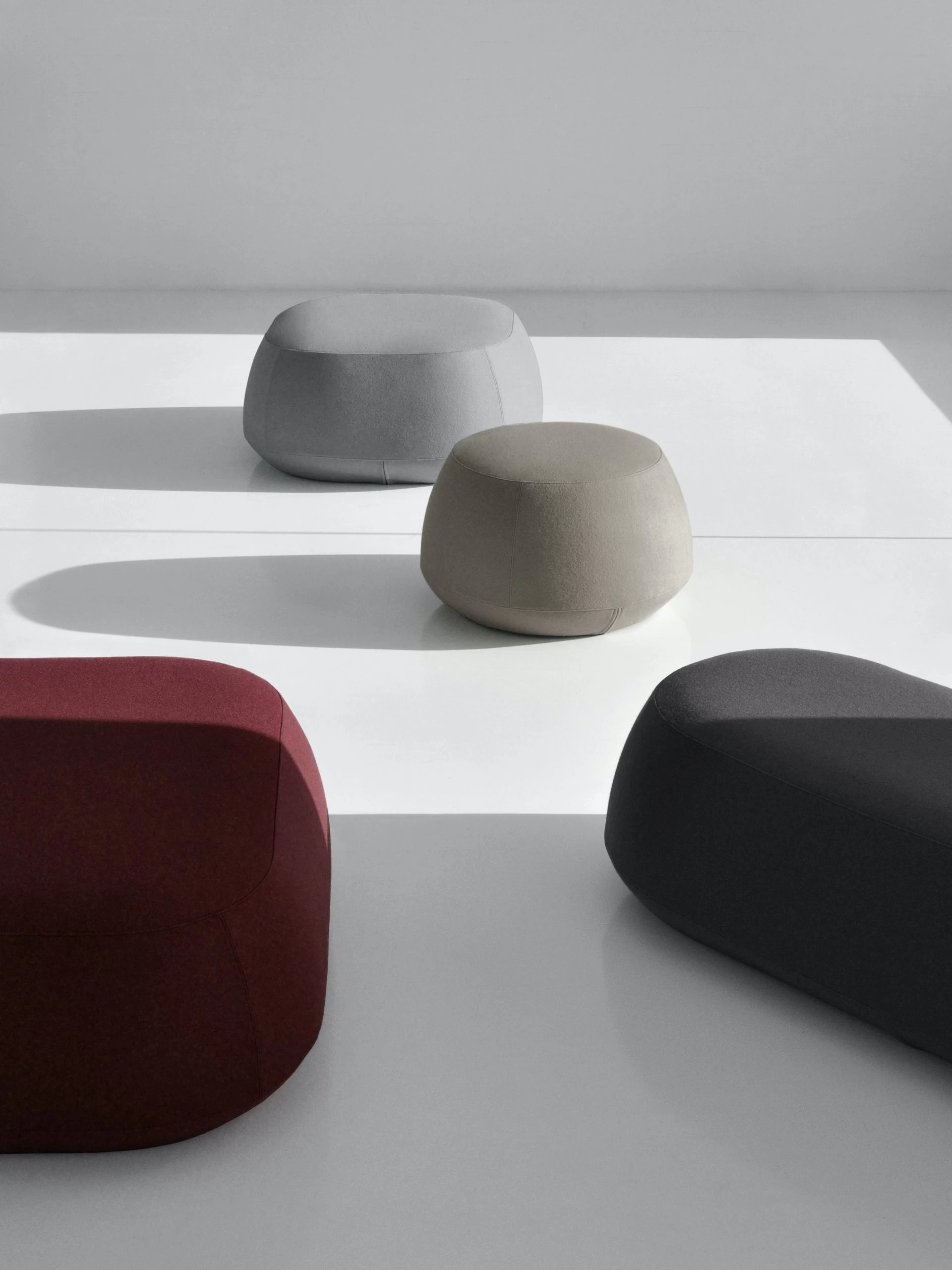 Ile Poufs and Ottomans are flexible additions to any space. Multi-functional as lounge seating, small tables, or stools. The Ile series of ottomans share the same under-cut prominent on the U Turn lounge chair.
