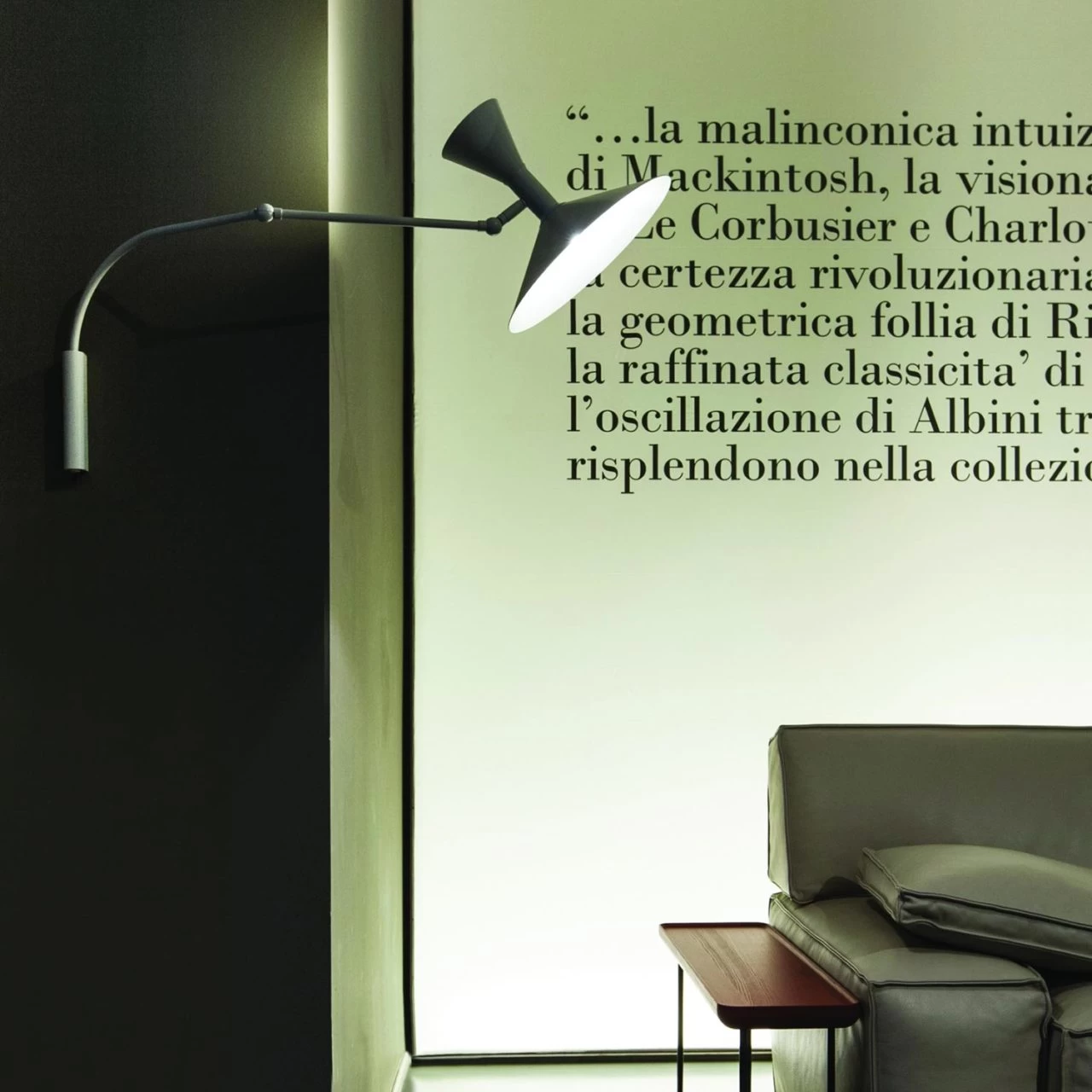 The Mini version of Corbusier’s Lampe de Marseille designed for the Unité d Habitation of Marseille in 1949/1952. An adjustable wall lamp with two joints on the arm and a rotating wall fixing. Available with matt grey, whitewash or black body, with white internal diffusers. Direct and indirect lighting output. Double switch on the cable, for a functional and adjustable light output.