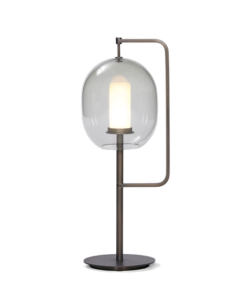 Table lamp with a frame in solid brass, lampshade in hand-blown grey crystal glass. Diffusor in opal white satin-finished glass. Dimmable.Â