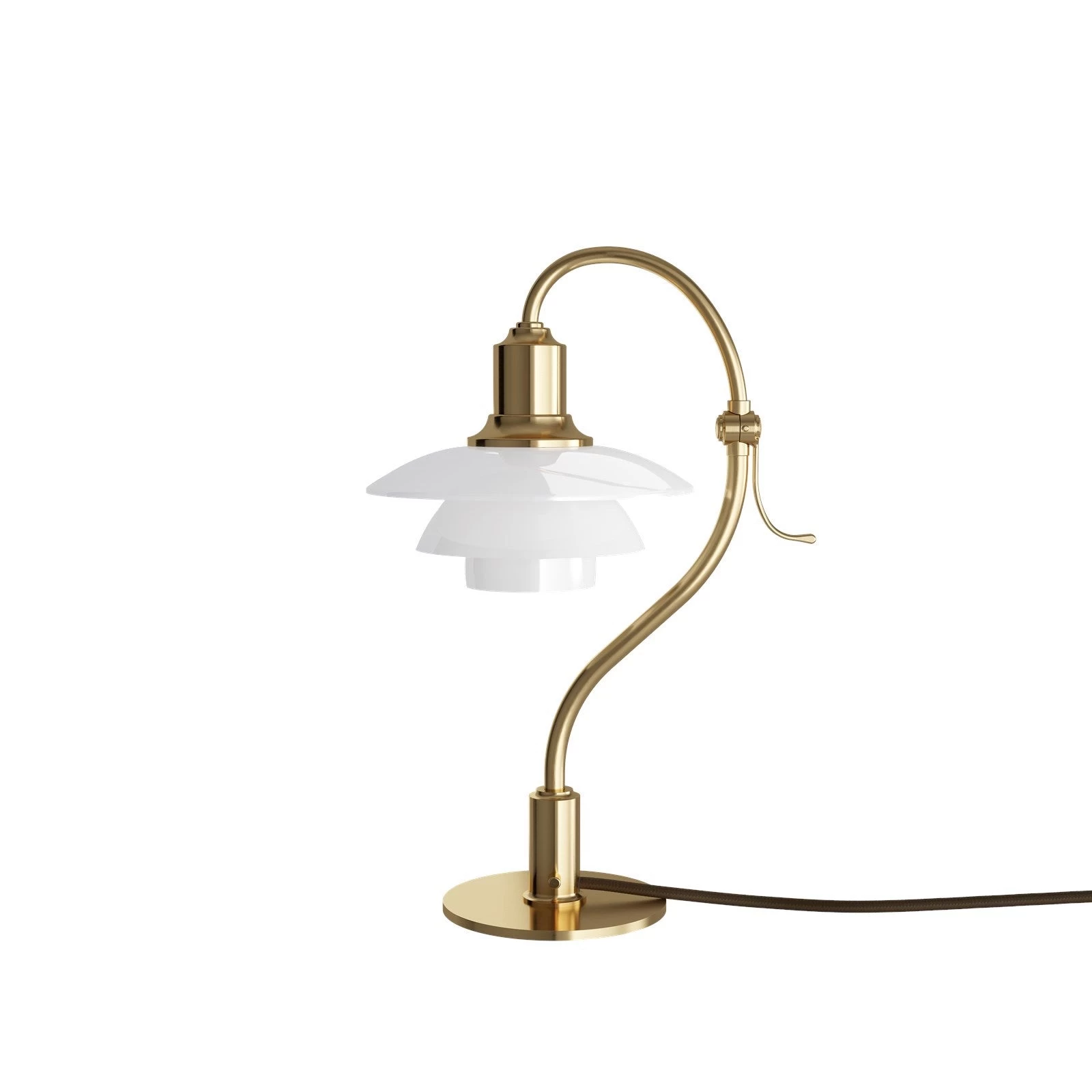 The 2021 limited edition of PH 2/2 The Question Mark comes with an adjustable lamp head, similar to the original lamp, that can rotate 45 degrees to either side. The adjustable upper part of the lamp can be tilted 45 degrees to the right or left by turning the handle. The shades of mouth-blown triple-layered opal glass add a natural individuality to the lamp where each shade represents a work of art. As with the original lamp, the brass will patinate over time and enhance the beautiful authentic look and feel of the 2021 limited edition of the PH 2/2 The Question Mark. Also made of brushed brass, a go-through switch is located on the stem near the base, alongside a brown textile cord that complements the exclusive design. PH’s initials are beautifully and discreetly engraved above the cord.