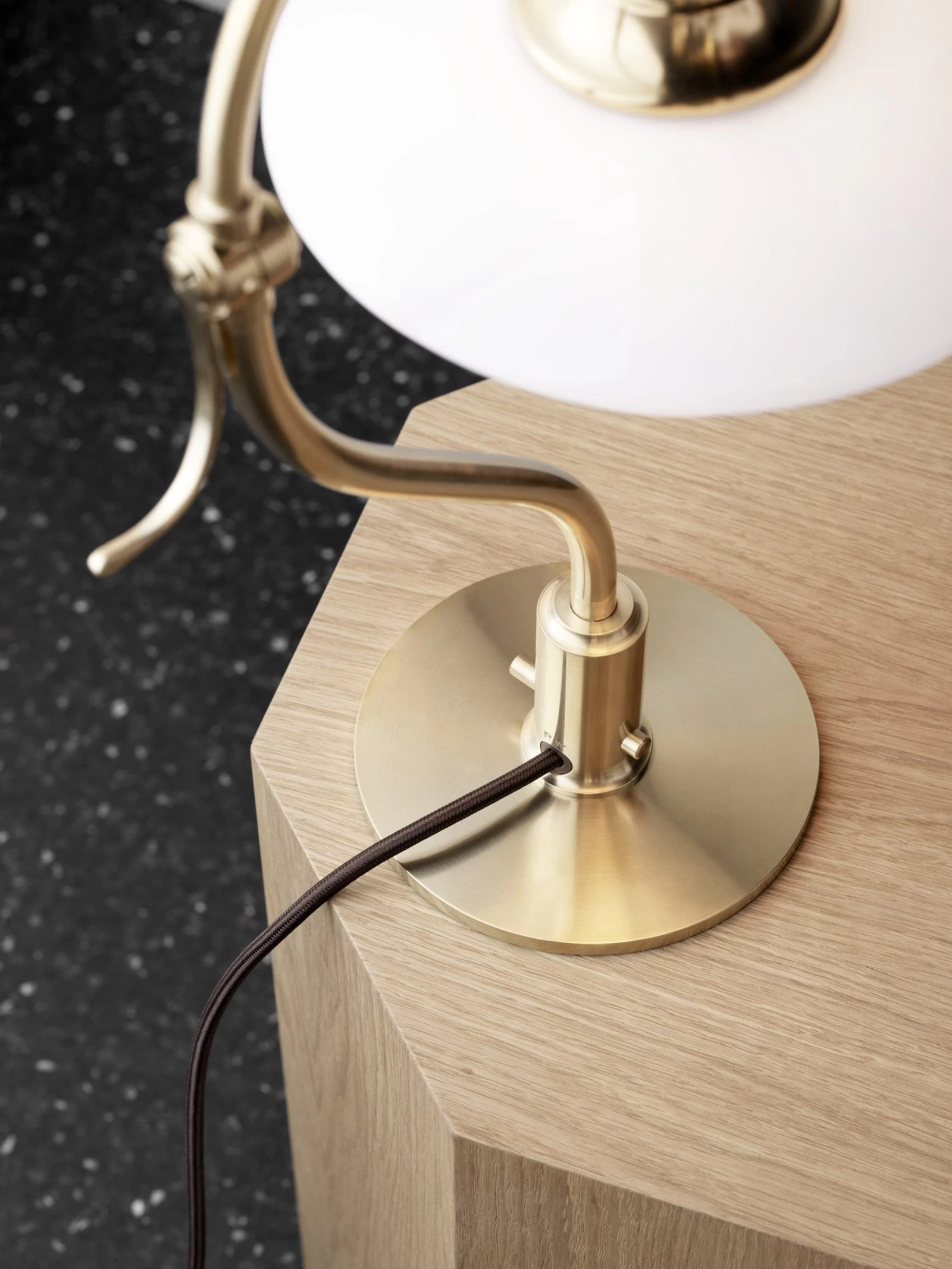 A limited-edition table lamp in brushed brass with a mouth-blown opal glass shade, brown textile cord and a go-through switch at the base.Â