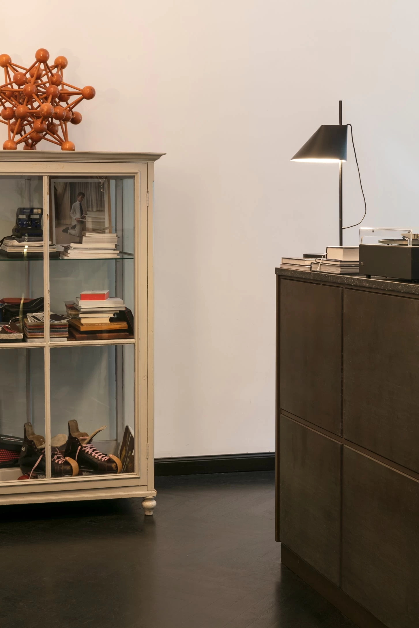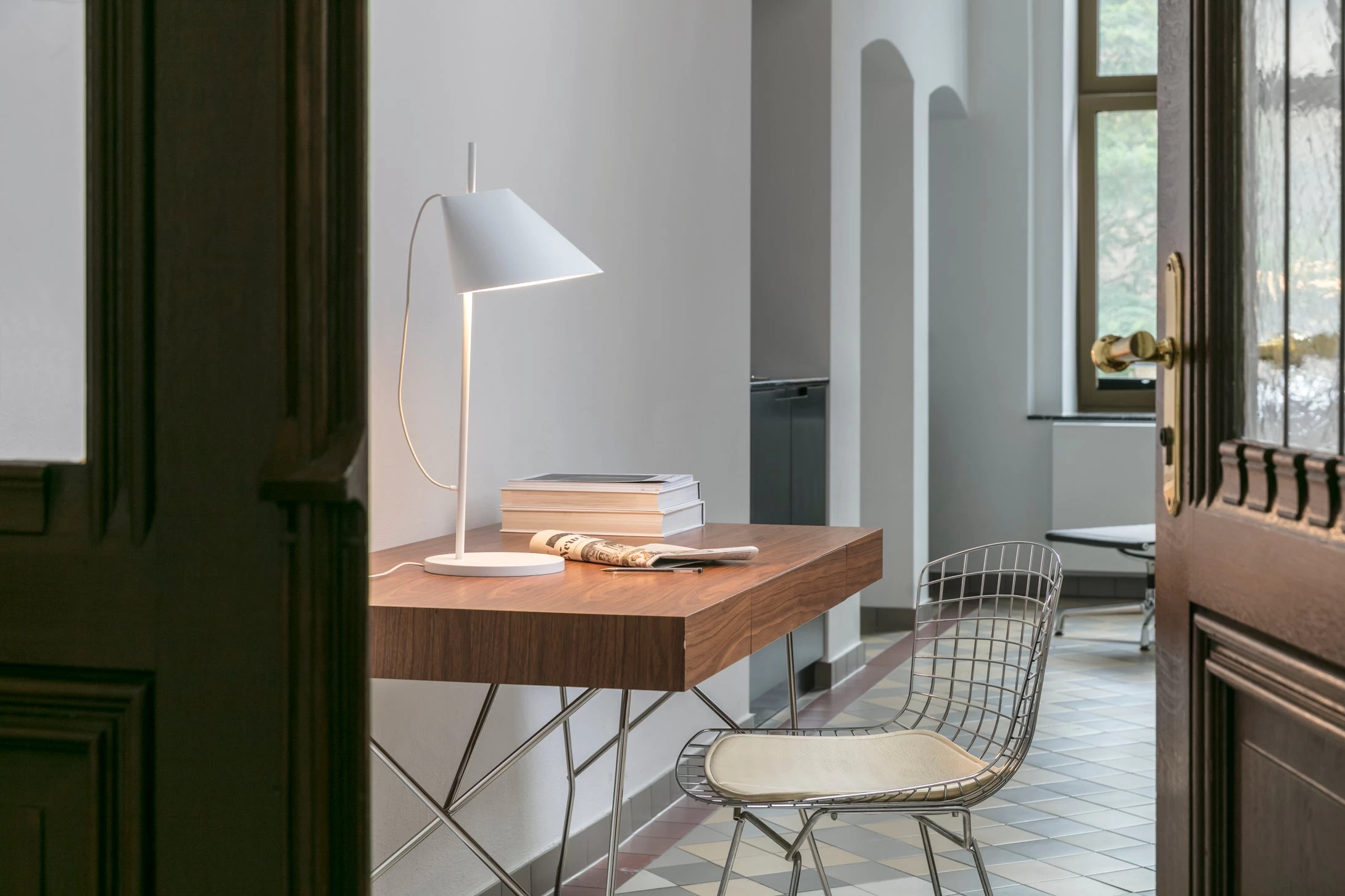 The Yuh table lamp primarily provides glare-free downward directed light. The angle of the shade can be adjusted to optimize light distribution. A slim opening in the top of the shade provides soft, ambient upward illumination and a mechanical system provides great freedom of movement, so the light can always be set in the ideal position in the workspace, living room etc. Built-in LED technology provides a high quality of light with stepless dimming at 15 to 100%. Timer function to automatically turn off the light after amount of time, selectable between off, 4 hours and 8 hours.