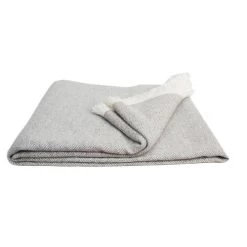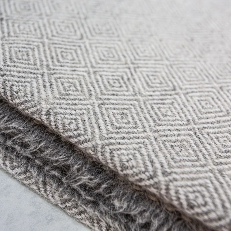 Woven alpaca and linen throw in soft grey and cream diamond pattern with a short fringe.