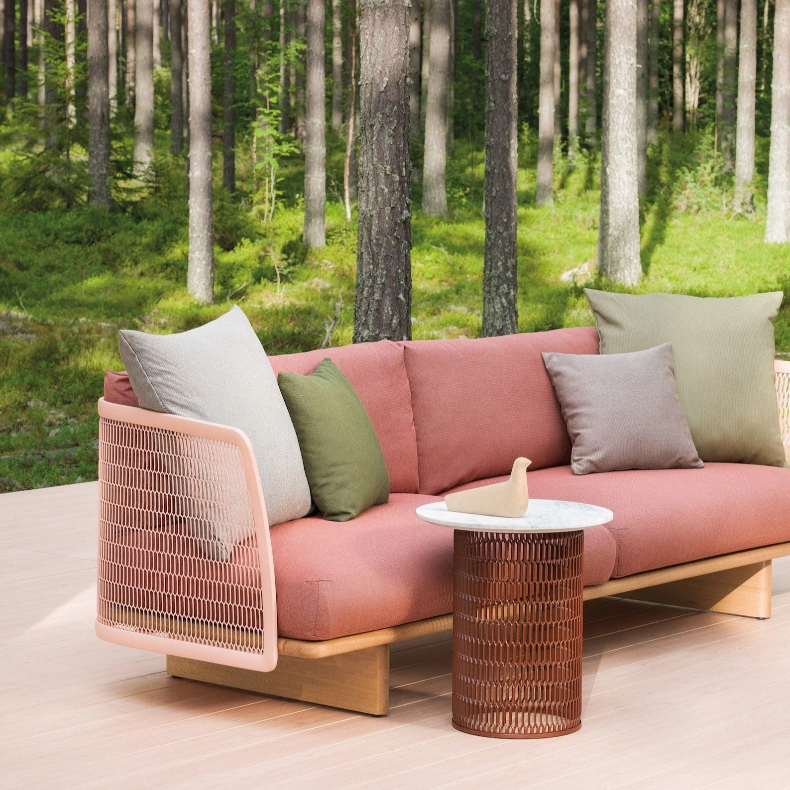 Kettal Mesh collection by Patricia Urquiola recalls architectural facades, which filter the surrounding environment without stopping the light and airflow. Industrial and natural materials, hard and soft surfaces, and transparent and solid volumes are pitted face to face in order to create this family of outdoor furniture based in contrasts.