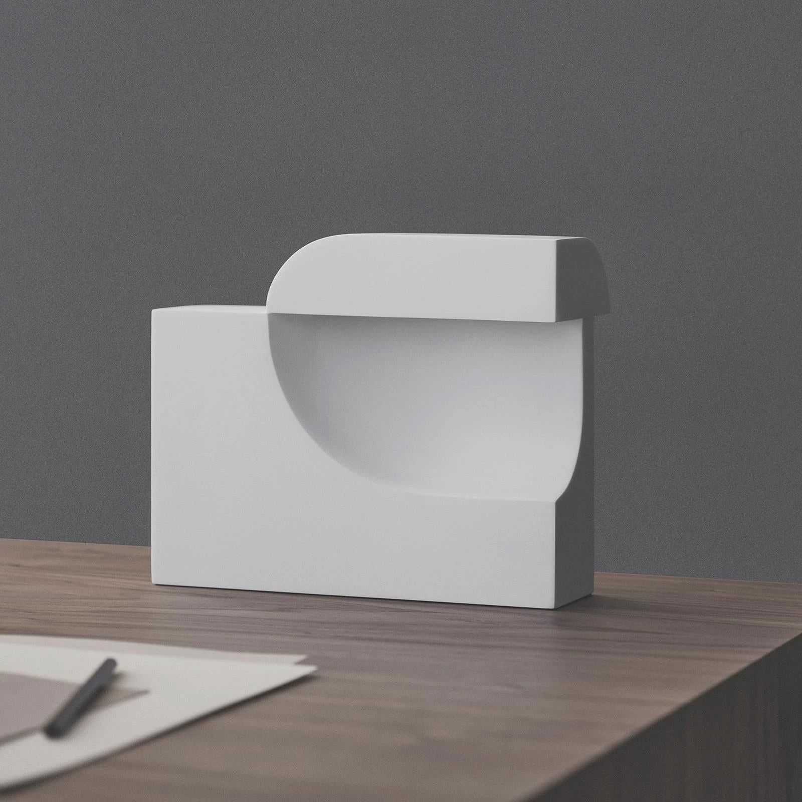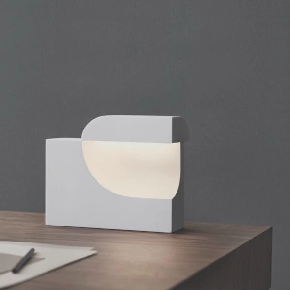 Moby is an extraordinarily sculptural table lamp. Filled with intriguing contrasts, it balances a soft and comforting light with a striking, futuristic design. The void in the main element creates a small cap in which the light source is enclosed. When Moby is on, the soft light unfolds and illuminates the cavity, immediately drawing the attention to the organic curves.