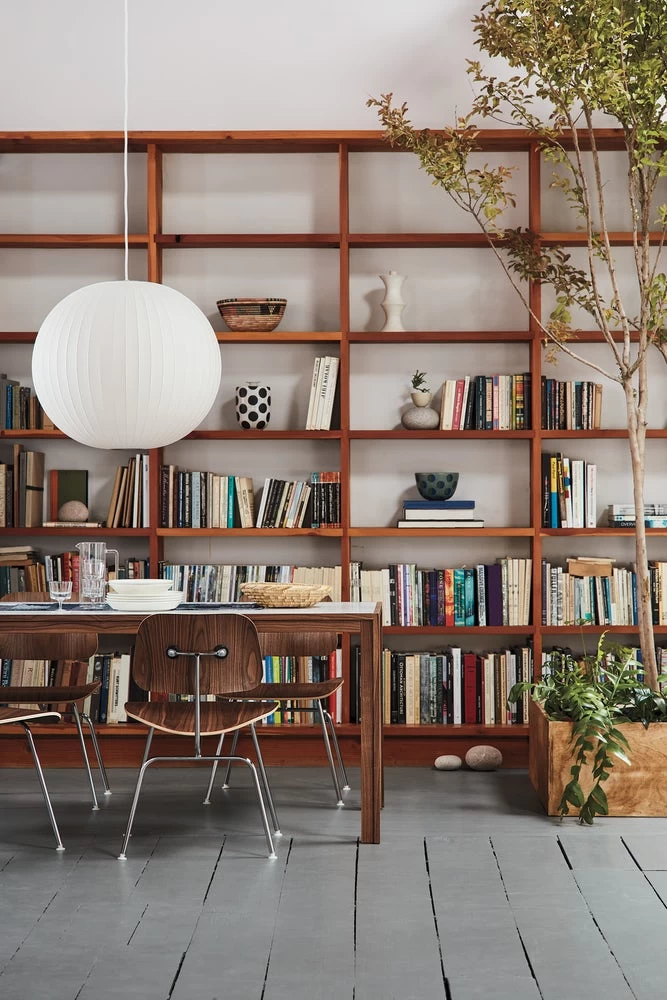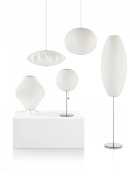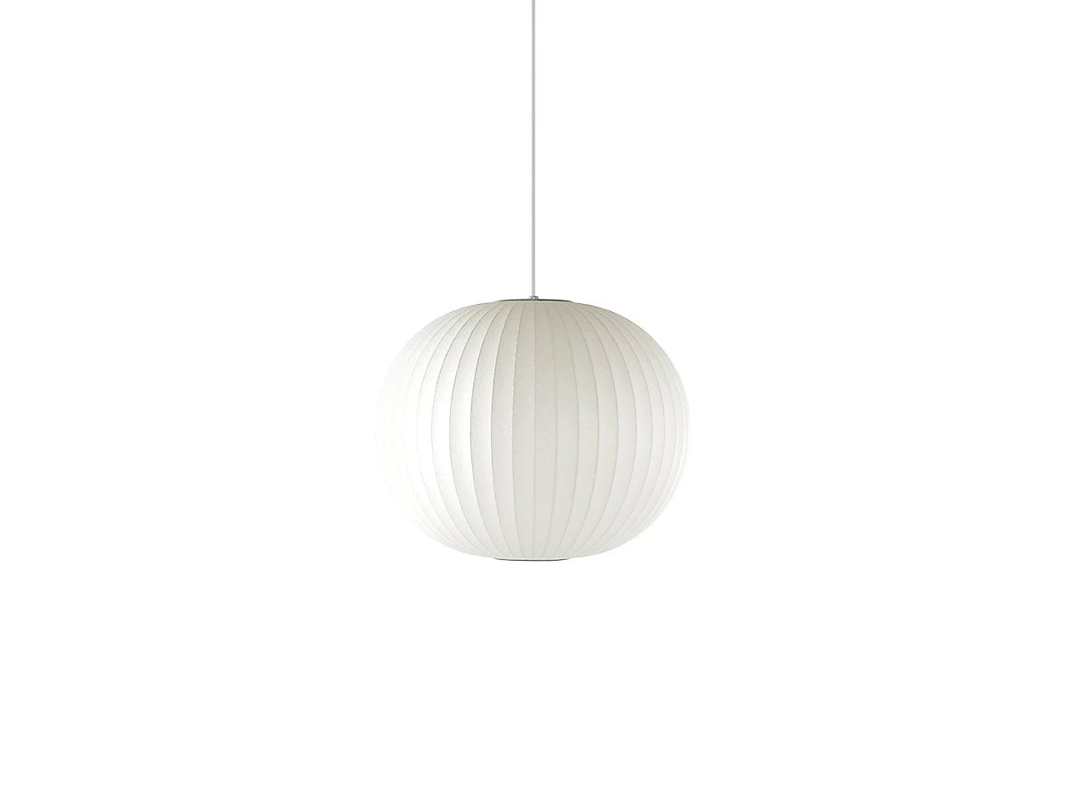 In charming spherical silhouettes, the Nelson Bubble Lamps add a touch of softness and luminosity to interiors. The Ball Bubble Pendant is available in three sizes and its perfectly rounded form is attached to a ceiling plate with a six-foot-long cord. The Bubble Lamps were first designed in 1952 when Nelson was impressed by a set of Swedish hanging lamps. Their prohibitive price prompted Nelson to design his own in a way that made them more affordable. The result was a series of lamps with elemental, spherical shapes like a rounded apple, an elongated cigar, and a shapely pear, among others.